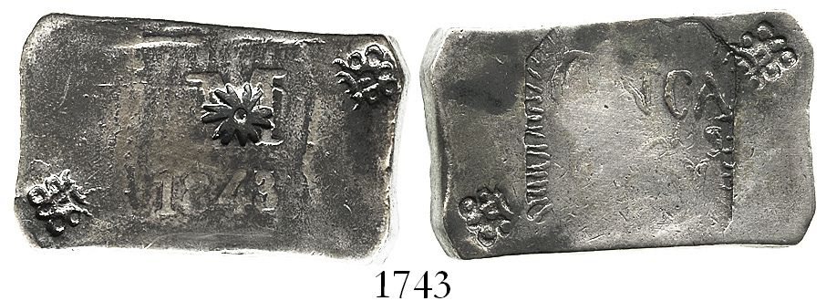 Mozambique, onca ("canelo"), 1843, rare. KM-26.1. 26.5 grams. Rectangular coin with square design (VG, weak but clear date and denomination, which are rarely visible) overstruck with 3 countermarks (one flower and 2 ornaments, XF), typically crude but nice for what it is.
