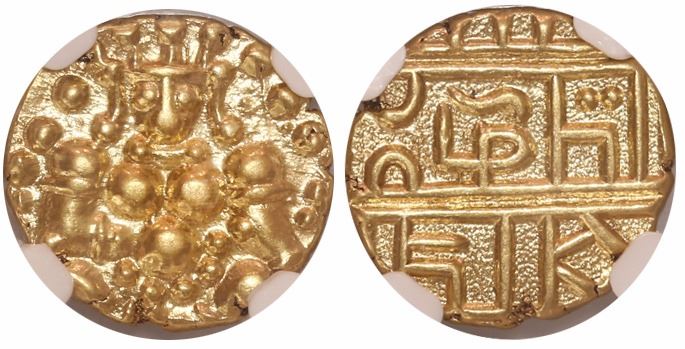 Mysore, India, pagoda, Tipu Sultan (AH 1215-1227 / 1787-1799 AD, struck 1782-99 AD), encapsulated NGC AU 55. KM-211. Lustrous and bold, light yellow color.