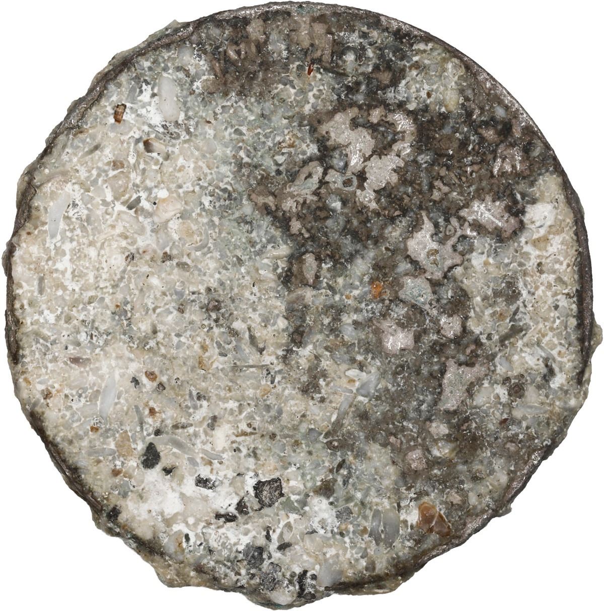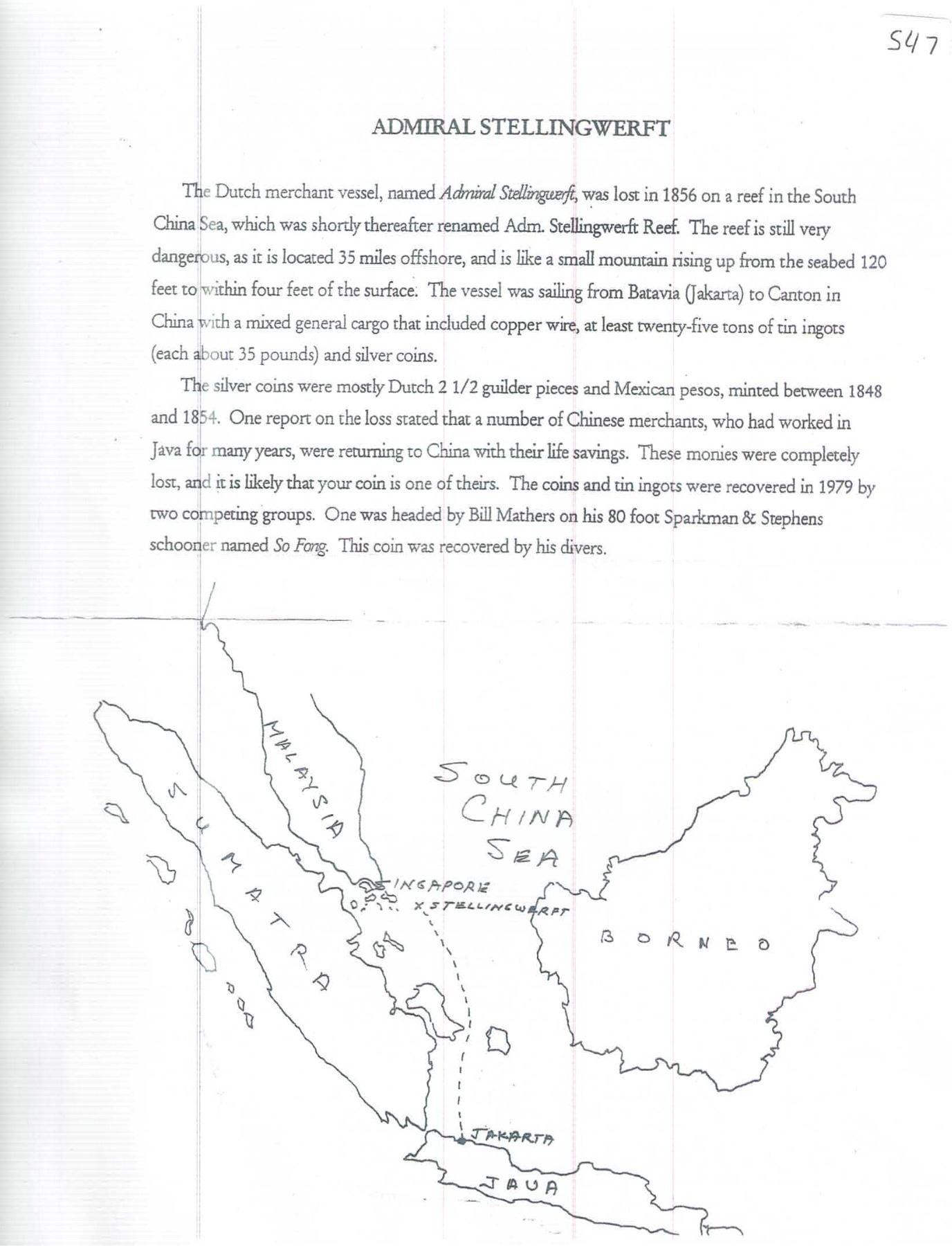 NETHERLANDS (Kingdom), mint uncertain, 2½ gulden, probably Willem III, date not visible (mid-1800s), rare provenance. KM-82. 27.25 grams total. Solid coin but with no visible details due to thick cocoon of whitish encrustation. Recovered by Bill Mathers in 1979, with copy of explanation letter and hand-written map showing the location of the wreck on an eponymous reef in the South China Sea (near Singapore) that is famous also for being the location of the 1752 wreck Geldermalsen ("Nanking Cargo"). The ship was named after a Dutch Naval hero in the Anglo-Dutch wars of the mid-1600s. Recovered from: Admiral Stellingwerf, sunk in 1856 off Bintan Island, Indonesia