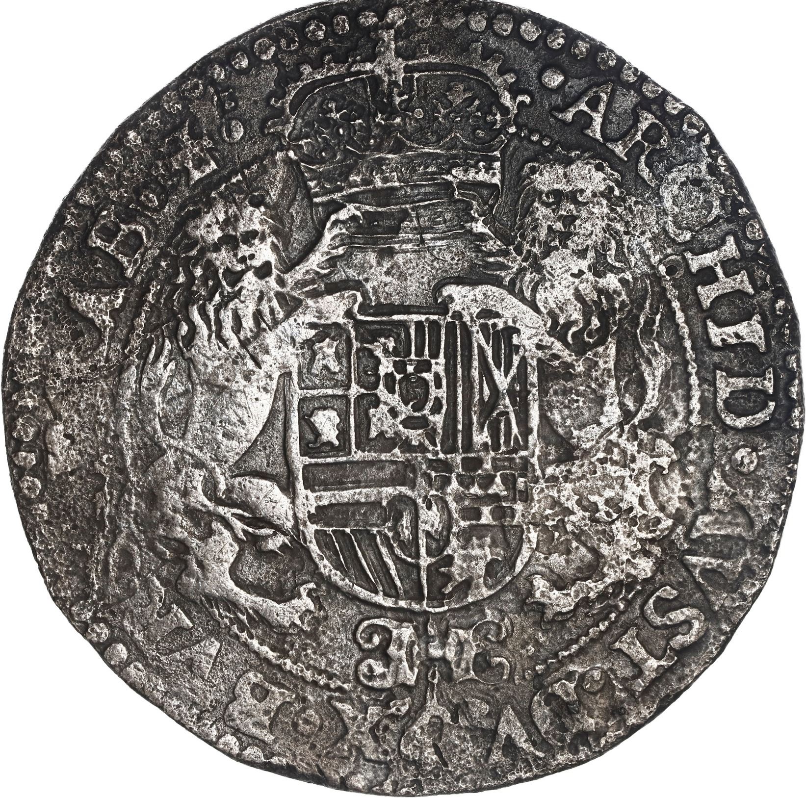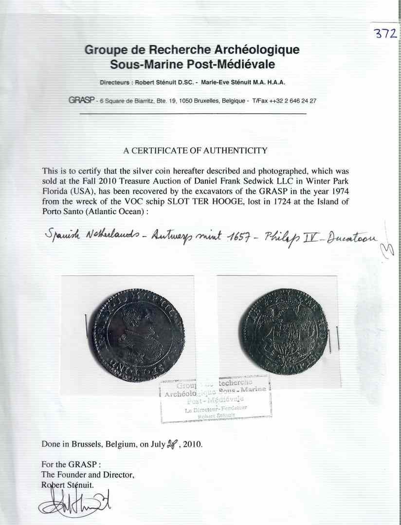NETHERLANDS (Spanish), Brabant, Antwerp mint, portrait ducatoon, Philip IV, 1657. Dav-4454; KM-72.1. 29.77 grams. Broad flan with choice full legends including date and hand mintmark, some very light surface corrosion but some fields clean and actually lustrous, nice portrait, gunmetal toning throughout. Pedigreed to Sedwick Auction 8, with original lot-tag 904 and original 2010 photo-certificate from the salvor (Robert Sténuit). Recovered from: Slot ter Hooge, sunk in 1724 off the Madeira Islands, northwest of Africa