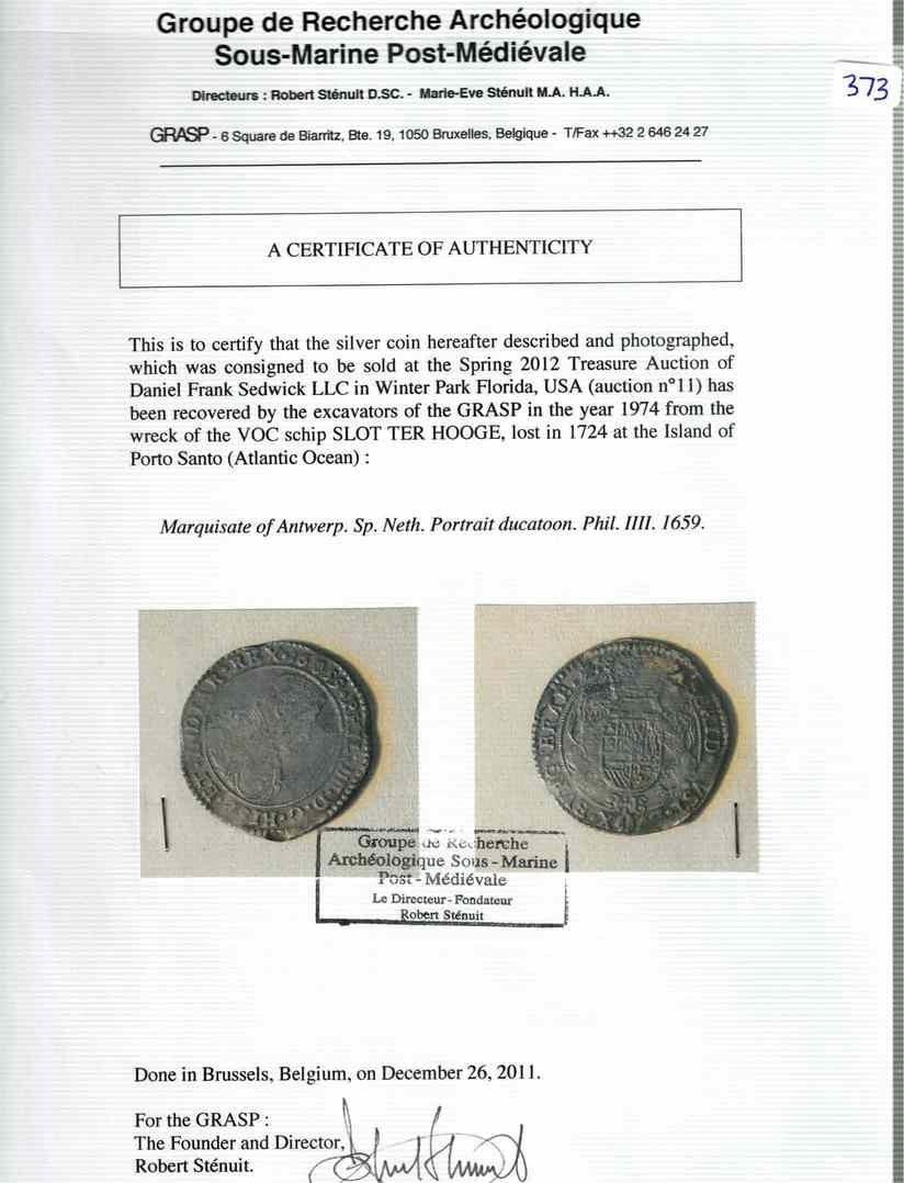 NETHERLANDS (Spanish), Brabant, Antwerp mint, portrait ducatoon, Philip IV, 1659. Dav-4454; KM-72.1. 31.99 grams. Broad flan with full legends including date and mintmark (hand), full but weaker inner details, toned all over (slightly colorful), minimal surface corrosion. Pedigreed to Sedwick Auction 11, with original lot-tag 480 and original 2011 photo-certificate from the salvor (Robert Sténuit). Recovered from: Slot ter Hooge, sunk in 1724 off the Madeira Islands, northwest of Africa