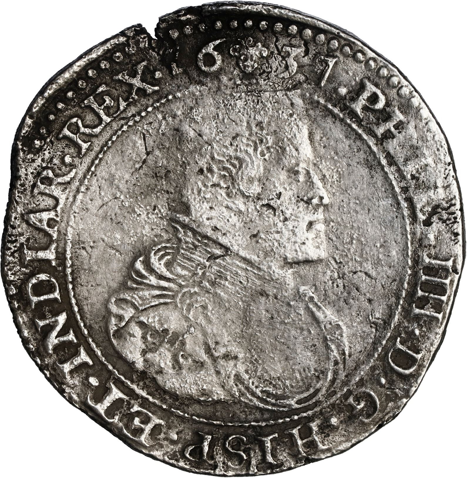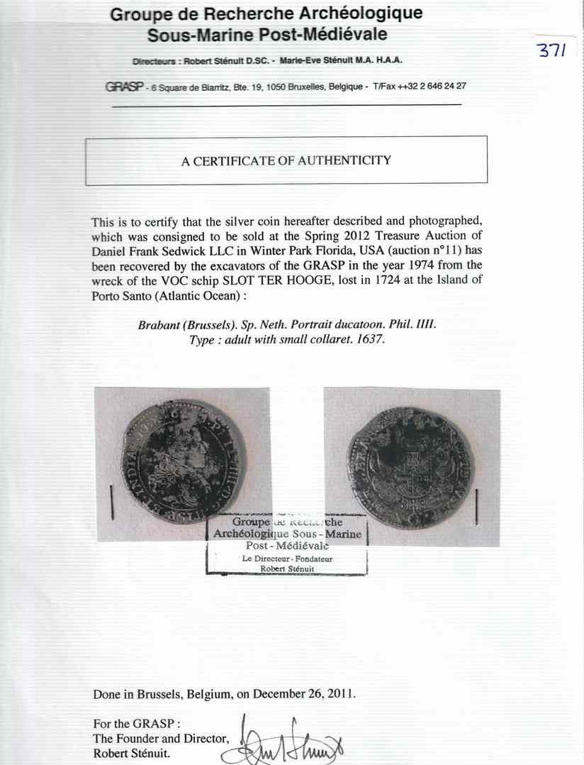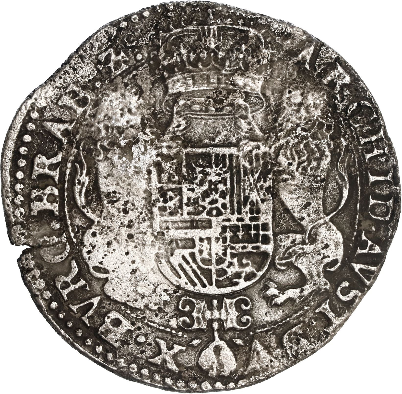 NETHERLANDS (Spanish), Brabant, Brussels mint, portrait ducatoon, Philip IV, 1637. Dav-4454; KM-72.1. 29.13 grams. Broad flan extending past the outer border in places, 100% full and bold legends including date and facing-head mintmark, but weaker inner details, light surface corrosion and toning. Pedigreed to Sedwick Auction 11, with original lot-tag 468 and original 2011 photo-certificate from the salvor (Robert Sténuit). Recovered from: Slot ter Hooge, sunk in 1724 off the Madeira Islands, northwest of Africa