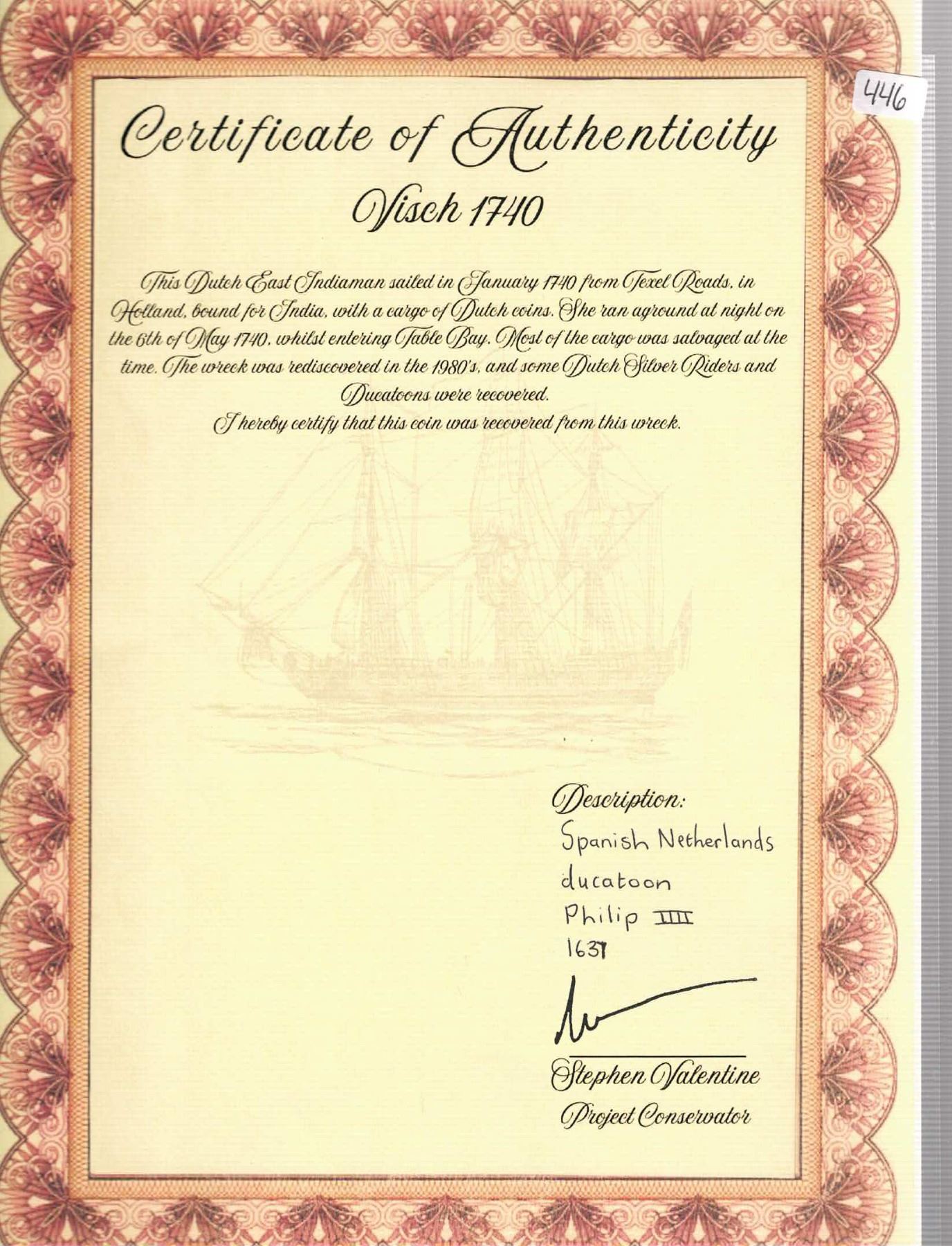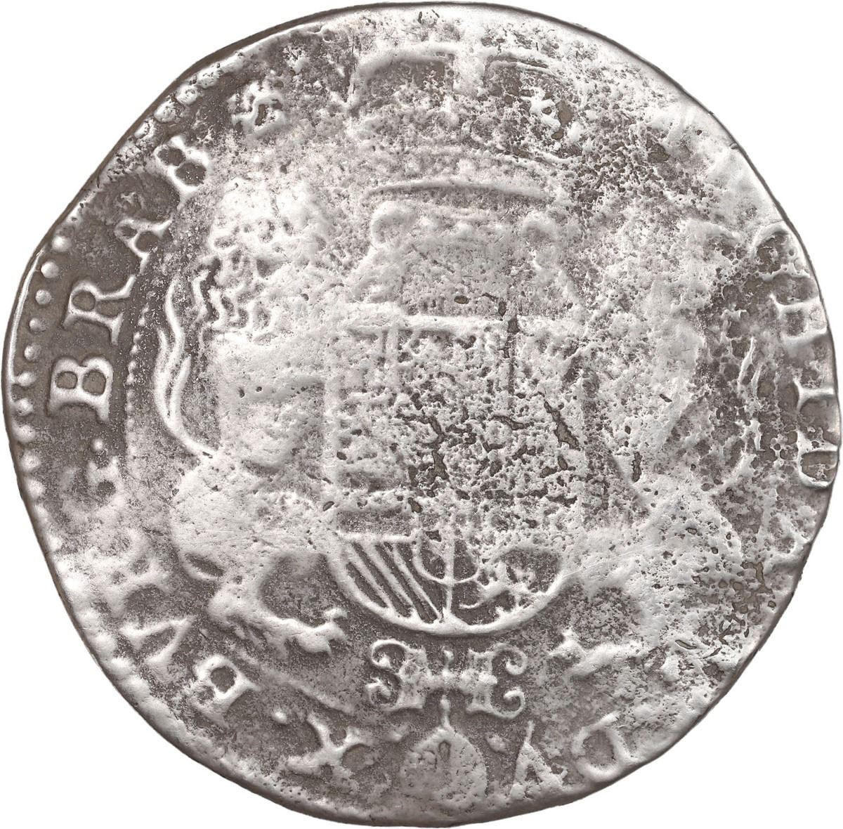 NETHERLANDS (Spanish), Brabant, Brussels mint, portrait ducatoon, Philip IV, 1637. Dav-4454; KM-72.1. 28.82 grams. Nearly full legends and inner details despite corrosion and wear, faintly toned on fields. Pedigreed to the Steve Valentine Collection, with original certificate from the salvor/conservator. Recovered from: De Visch, sunk in 1740 off South Africa