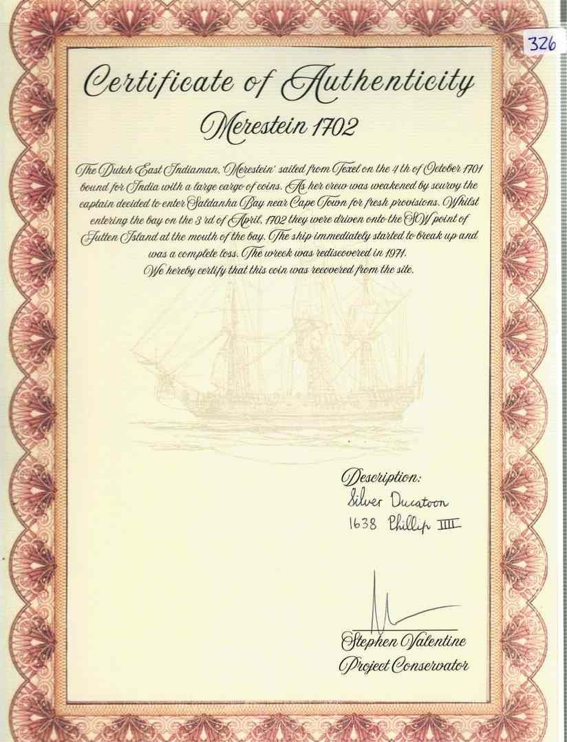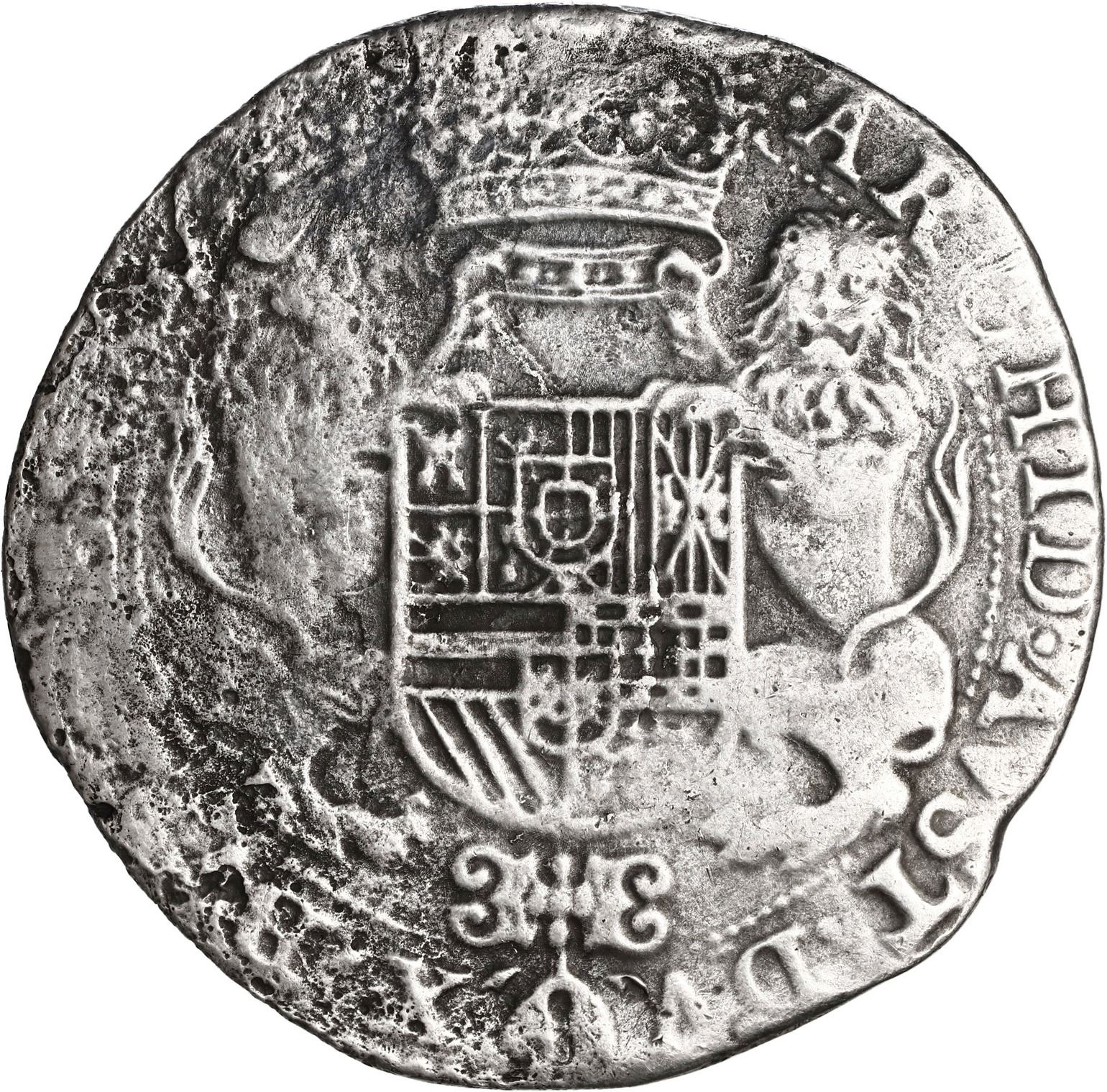 NETHERLANDS (Spanish), Brabant, Brussels mint, portrait ducatoon, Philip IV, 1638. Dav-4454; KM-72.1. 26.69 grams. Broad flan with bold full legends including date and mintmark (facing head), the inner details clear but the bust a bit corroded, toned in crevices. Pedigreed to the Steve Valentine Collection, with original certificate from the salvor/conservator. Recovered from: Merestein, sunk in 1702 off South Africa