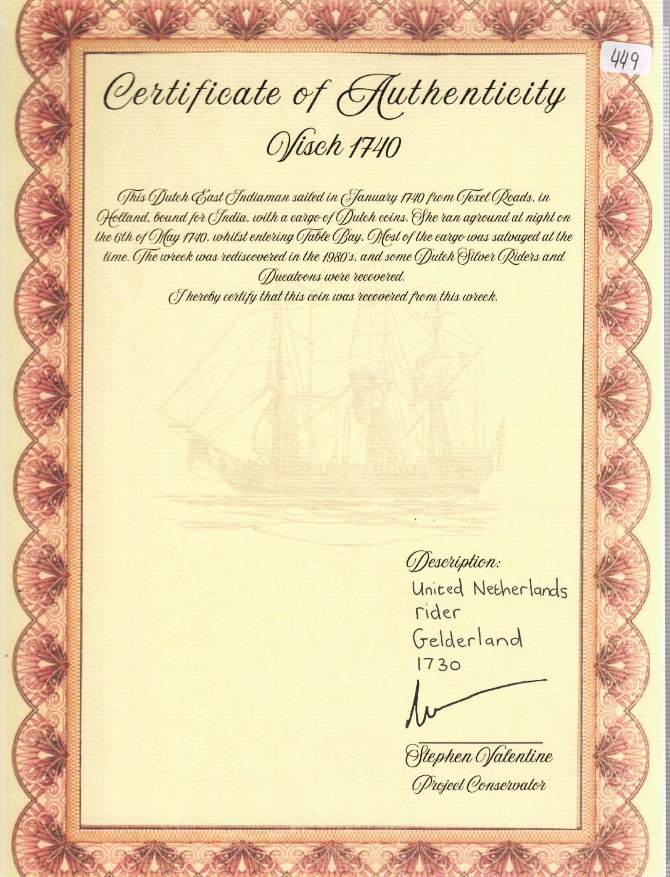 NETHERLANDS (United), Gelderland, "rider" ducatoon, 1730. Dav-1824; KM-95.3. 28.19 grams. Choice AU- details despite light surface corrosion, full rims, nicely contrasting toning. Pedigreed to the Steve Valentine Collection, with original certificate from the salvor/conservator. Recovered from: De Visch, sunk in 1740 off South Africa