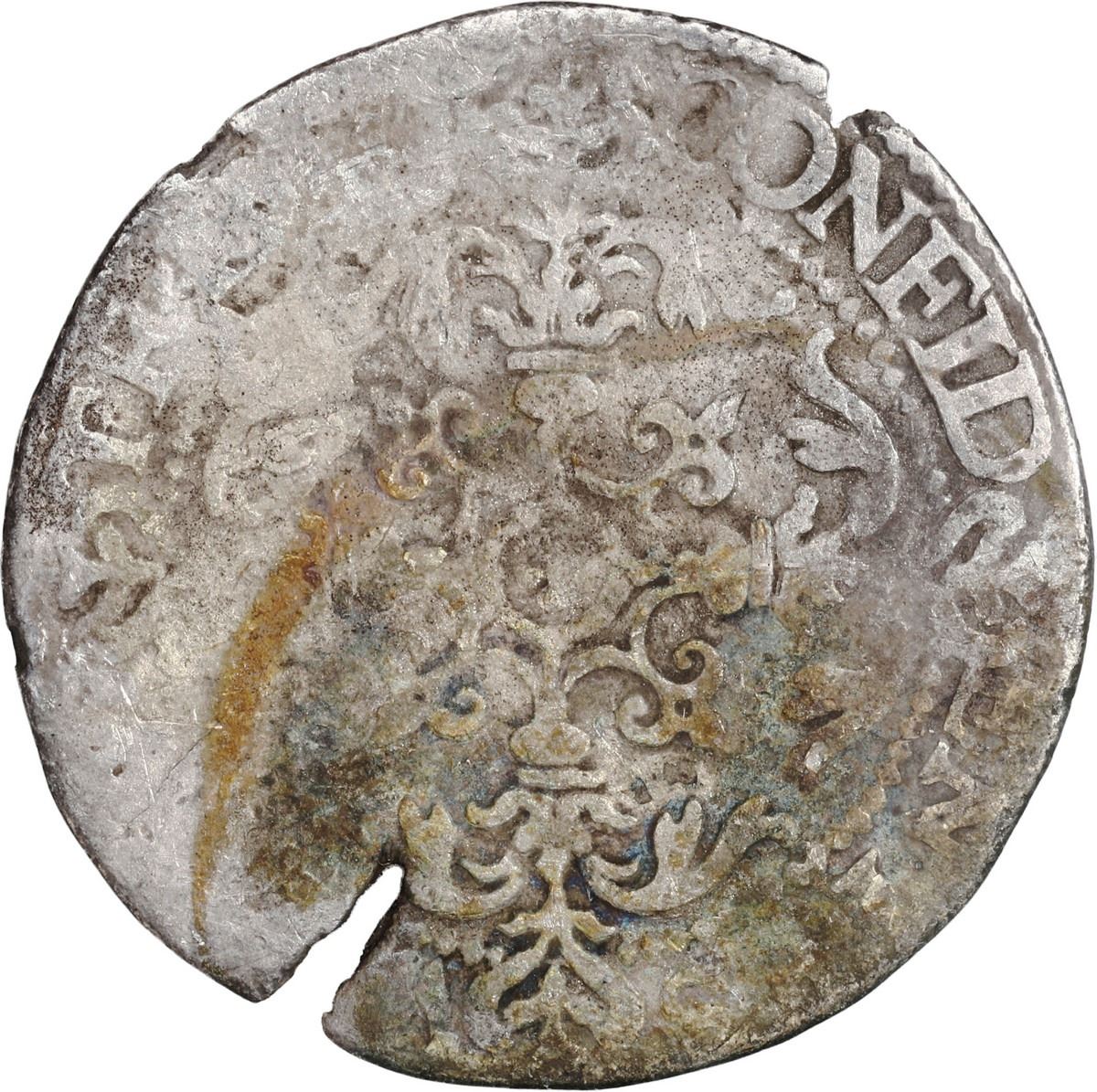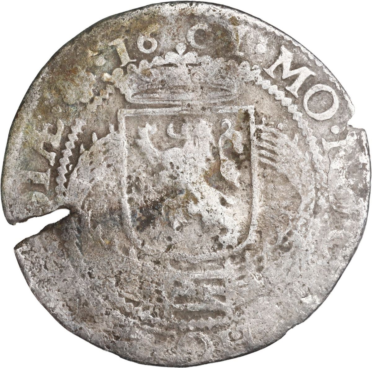 NETHERLANDS (United), Holland, 6 stuivers (roosschelling), 1601. KM-7. 3.54 grams. Slightly corroded but with nearly complete details, clear date, two natural edge-cracks, dark gray-toned surfaces. Recovered from: Merestein, sunk in 1702 off South Africa