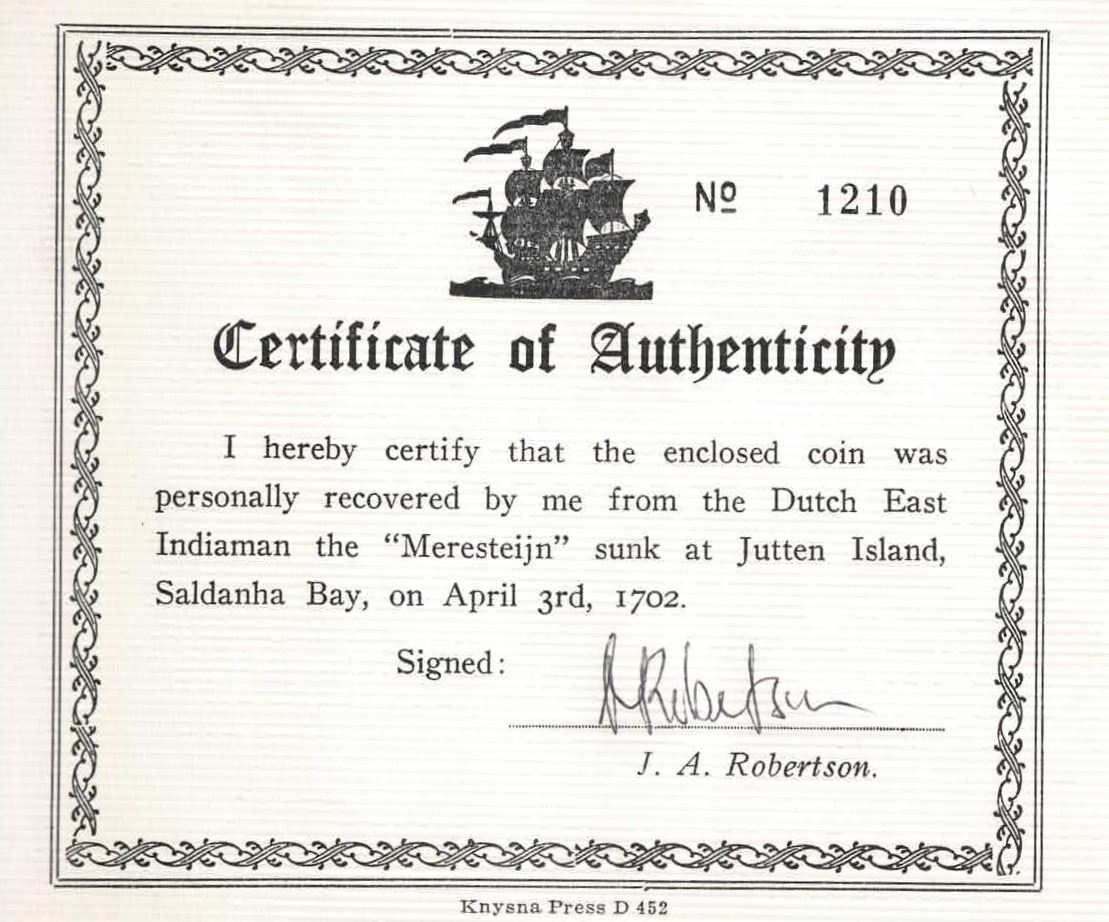 NETHERLANDS (United), Holland, Amsterdam mint, "rider" ducatoon, 1672, NGC VF details / sea salvaged (Shipwreck Blue Label). KM-2.3; Delm-1017; Dav-4933. Very deeply toned and solid (weight not specified but must be close to full) with sharp details all over, hairline edge-crack, surface corrosion on reverse only, one-year type with city arms between 6 and 7 in date at top (misattributed to Dav-4933A on label). With original (small, generic) certificate from the salvor. Recovered from: Merestein, sunk in 1702 off South Africa