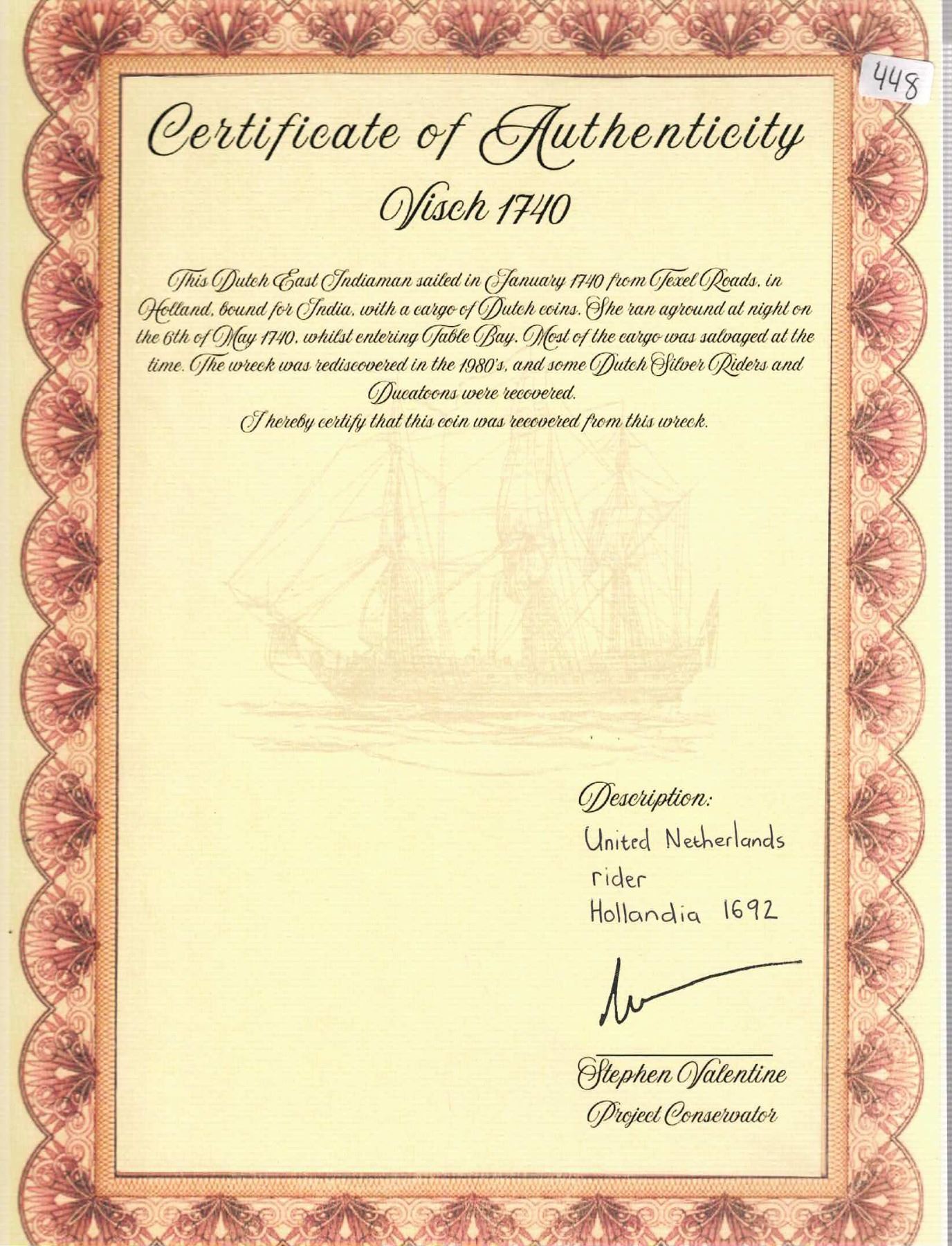 NETHERLANDS (United), Holland, "rider" ducatoon, 1692. Delm-1014; Dav-4930; KM-51. 28.53 grams. Nice XF details with minimal corrosion except near edge, lightly toned all over, scarce type (R.1 in Delmonte). Pedigreed to the Steve Valentine Collection, with original certificate from the salvor/conservator. Recovered from: De Visch, sunk in 1740 off South Africa
