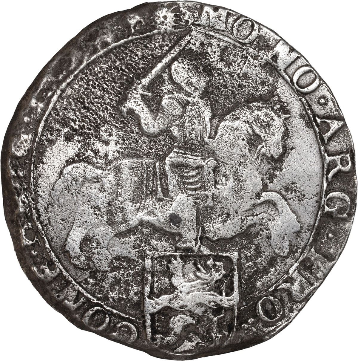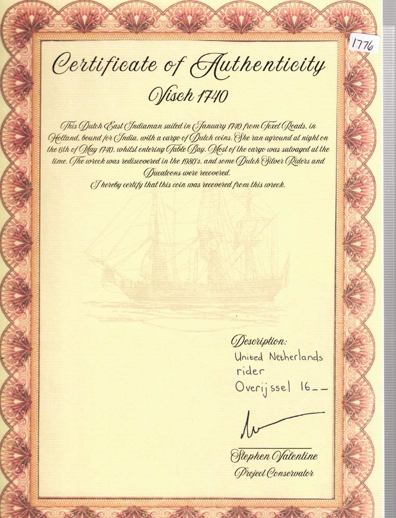 NETHERLANDS (United), Overijssel, "rider" ducatoon, 1668. KM-65.1; Delm-1034. 29.02 grams. Solid piece from this scarce wreck with corrosion mostly around the edges, bold central details. Pedigreed to the Steve Valentine Collection, with original certificate from the salvor/conservator. Recovered from: De Visch, sunk in 1740 off South Africa