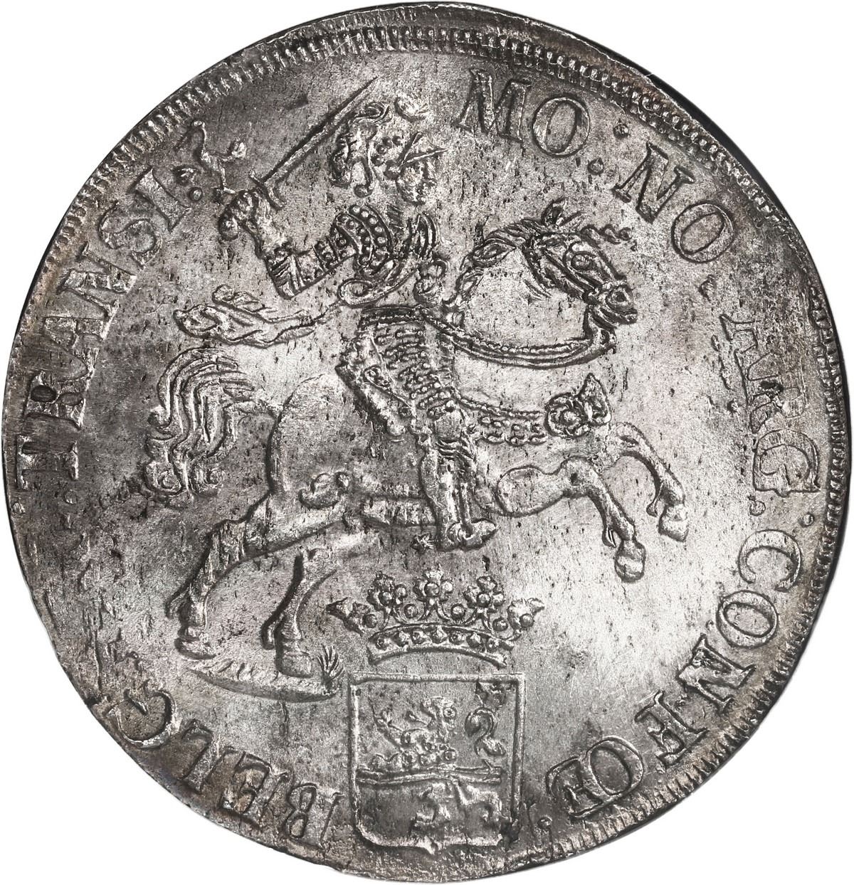 NETHERLANDS (United), Overijssel, "rider" ducatoon, 1733, NGC UNC details / saltwater damage (Shipwreck Blue Label). Delm-1036; Dav-1829; KM-80. Typically sharp full details with only traces of light surface corrosion near edge, lightly toned and lustrous. Recovered from: Vliegenthart, sunk in 1735 off Zeeland, Netherlands
