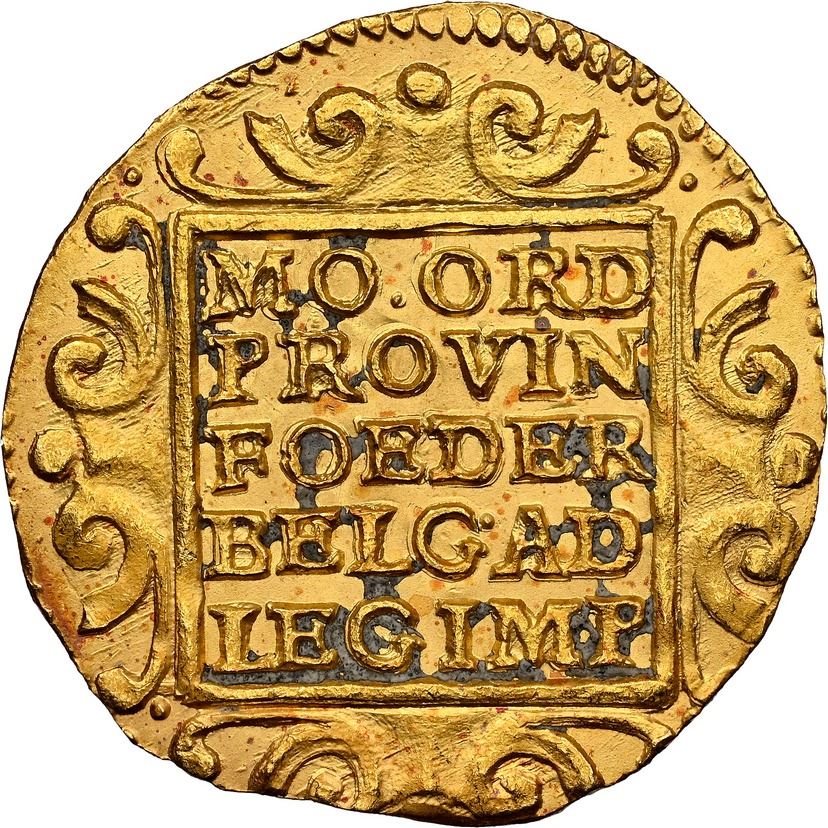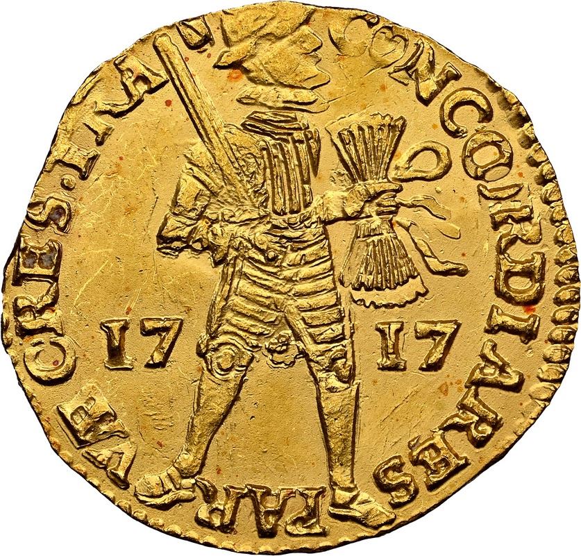 NETHERLANDS (United), Utrecht, gold ducat, 1717, NGC MS 62 (Shipwreck Blue Label), ex-Akerendam (1725). KM-7.1; Fr-285. From a small group of earlier dates recovered from the Akerendam, this 1717 example in second-highest grade with very sharp full details against satin smooth fields harboring muted luster, the obverse curiously doubled and the reverse with areas of dark encrustation in crevices. From the Akerendam, sunk in 1725 off Norway.
