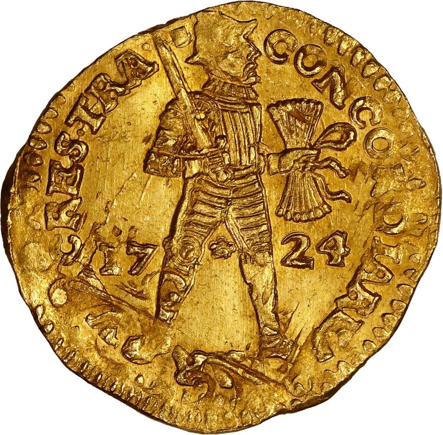 NETHERLANDS (United), Utrecht, gold ducat, 1724, NGC Mint Error MS 63 Flipover Double Strike (Shipwreck Blue Label). Delm-965; Fr-285; KM-7.4. 3.52 grams. Broad flan, rich gold color with much luster, knight's head typically weak, just a trace of the double-strike on both sides but clearly a flipover, which is unprecedented for this type (first we have seen). Recovered from: Akerendam, sunk in 1725 off Norway