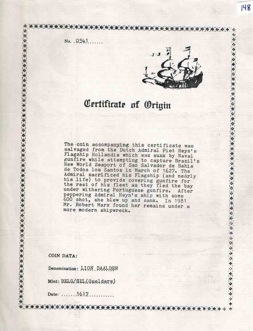 NETHERLANDS (United), Utrecht, "lion" daalder, 1617, very rare provenance, ex-Sebring. Dav-4863; KM-13. 26.81 grams. Solid coin with no corrosion (just a few small scrapes) and nicely toned, all inner details and legends clear, important as from a very rare wreck and with desirable pedigree. Note: The Sebring Collection catalog erroneously calls the mint Overijssel, and certificate calls it "Gelders," whereas the coin clearly shows TRA for TRAJECTUM (Latin for Utrecht). Pedigreed to the Tom Sebring Collection (American Numismatic Rarities auction of January 2004, lot 1602) and to the Christie's (Amsterdam) auction of March 1983, also to Sedwick Auction 17, with original lot-tag 367, with original certificate and copy of Sebring lot description. Recovered from: Piet Heyn's Hollandia, sunk in 1627 in the Bay of All Saints, Brazil