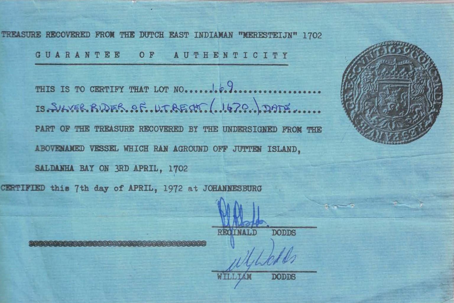 NETHERLANDS (United), Utrecht, "rider" ducatoon, 1670. KM-46.1; Delm-1029; Dav-4937. 22.86 grams. Corroded and somewhat encrusted though with a clear date and mint, desirable early hand-signed certificate. With original certificate hand-signed in 1972 by the salvors (Reginald and William Dodds). Recovered from: Merestein, sunk in 1702 off South Africa