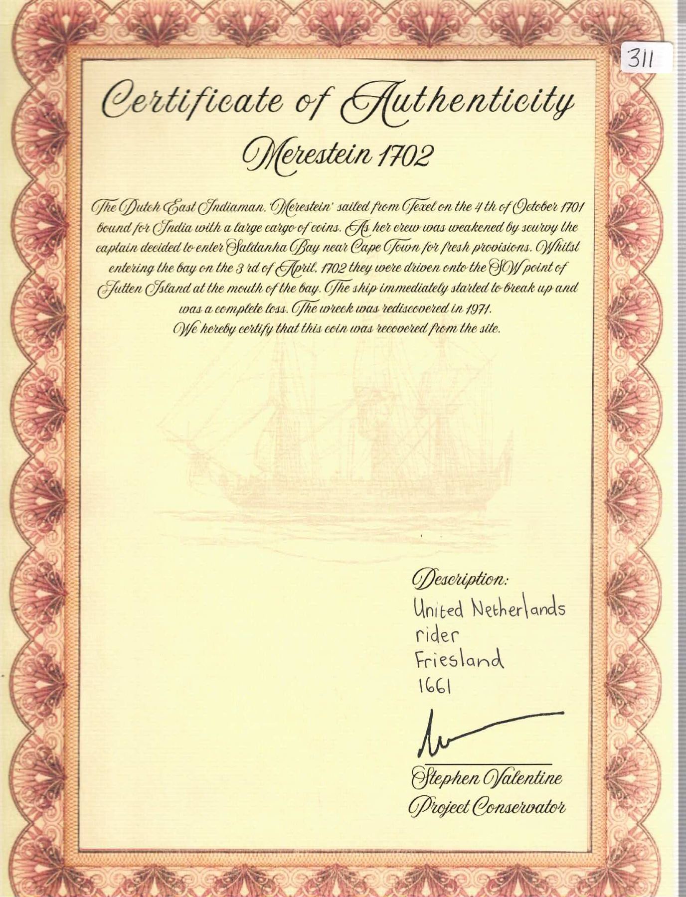 NETHERLANDS (United), Westfriesland, "rider" ducatoon, 1661. Delm-1019; Dav-4939; KM-46.1. 28.25 grams. Choice for this wreck with bold XF details, nearly full legends, nicely toned in crevices, minimal surface corrosion. Pedigreed to the Steve Valentine Collection, with original certificate from the salvor/conservator. Recovered from: Merestein, sunk in 1702 off South Africa