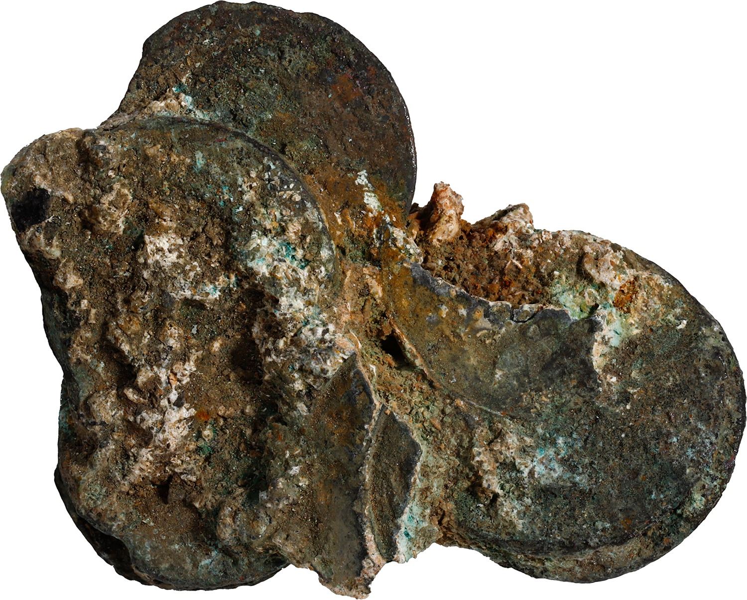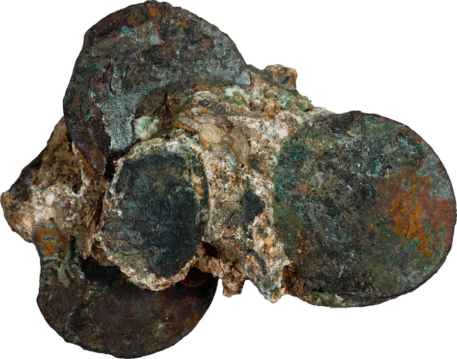 NETHERLANDS (United), Zeeland, clump of five copper duits plus parts of others, dates not visible (1752), encrusted as found. 25.70 grams total. Roughly 2" x 1¾" x ½". Scattered lump of coins fused together with bits of rocks and shells, most lightly encrusted with a little bit of design detail showing through. Recovered from: Bredenhof, sunk in 1753 off Mozambique, east of Africa