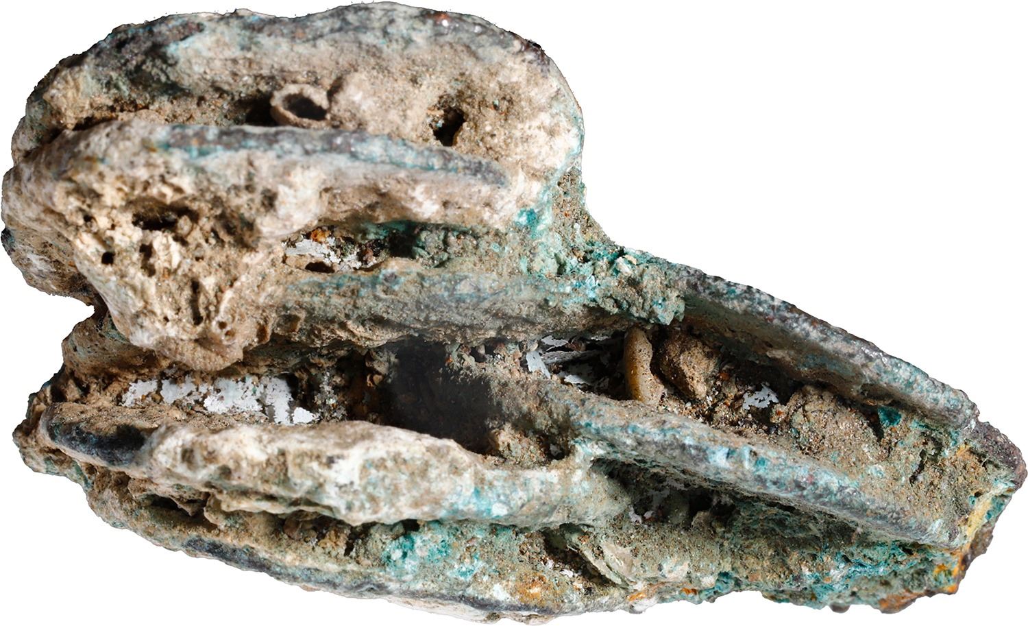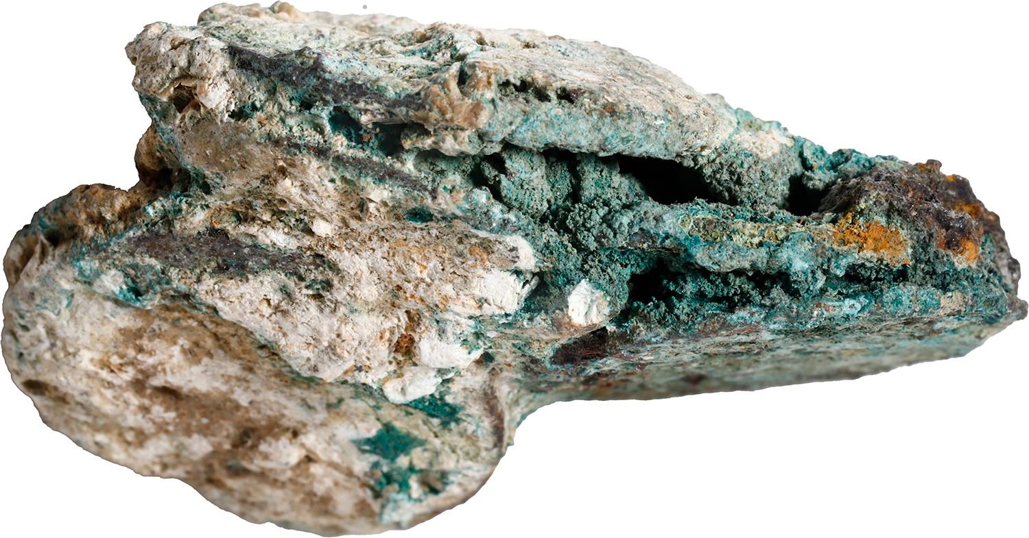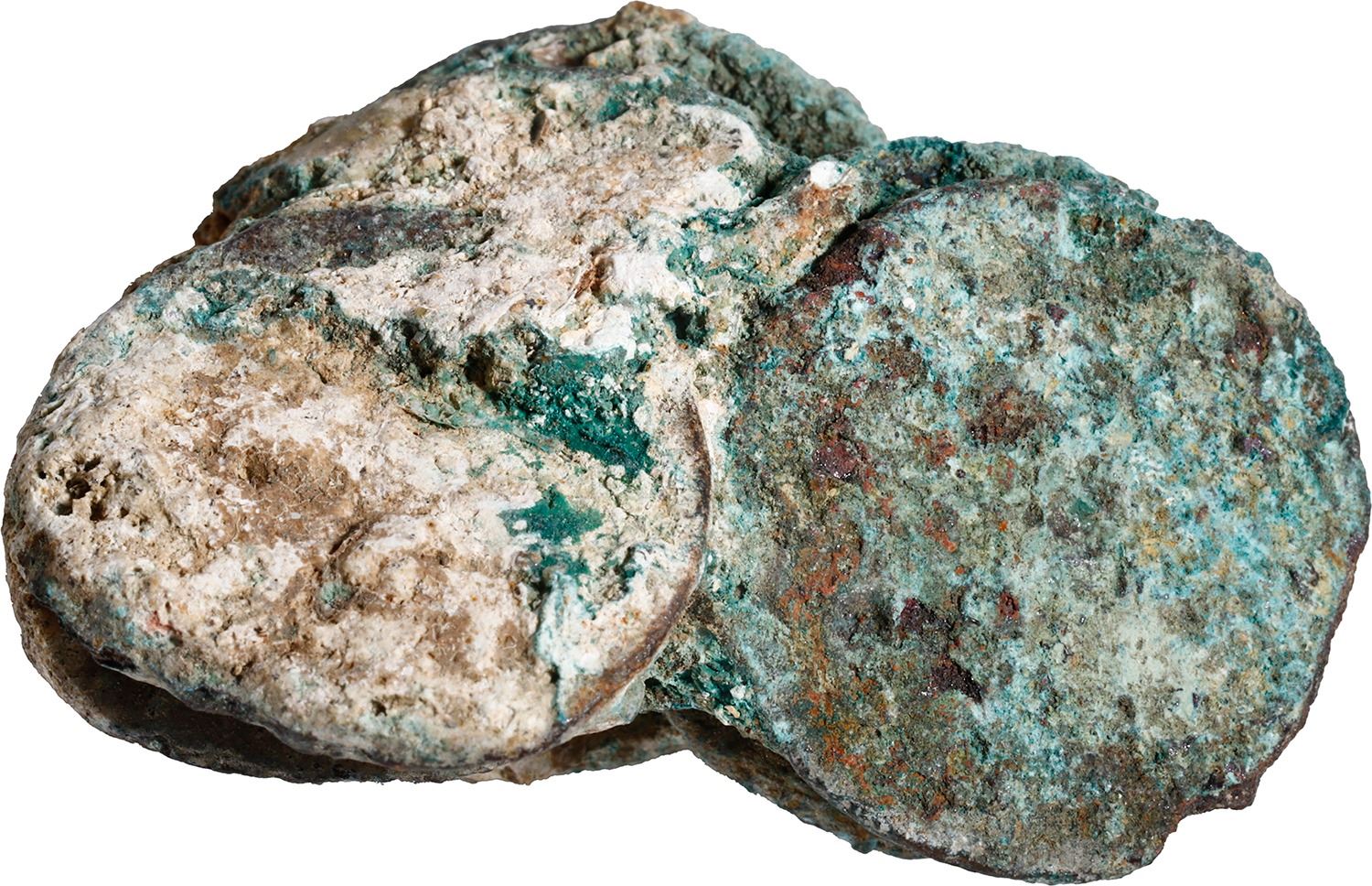 NETHERLANDS (United), Zeeland, clump of seven copper duits, dates not visible (1752), encrusted as found. 25.93 grams total. Roughly 1¾" x 1¼" x ¾". Neat little clump, fully encrusted with seven distinct coins inside, all surrounded by green and white sedimentation. Recovered from: Bredenhof, sunk in 1753 off Mozambique, east of Africa