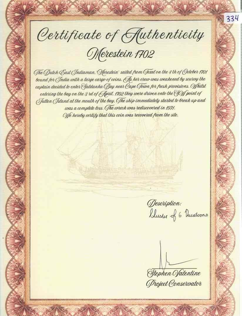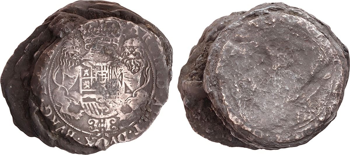 NETHERLANDS, mints uncertain, clump of six portrait (Spanish) and "rider" (United) ducatoons, encrusted as found, dates not visible. 140 grams total. roughly 2" x 1¾" x ¾". Very tight stack of thin (corroded) coins, a few in the middle protruding, all black-toned and free of debris or encrustation but end coins with fully exposed Spanish reverse on one and "rider" obverse on the other. Pedigreed to the Steve Valentine Collection, with original certificate from the salvor/conservator. Recovered from: Merestein, sunk in 1702 off South Africa