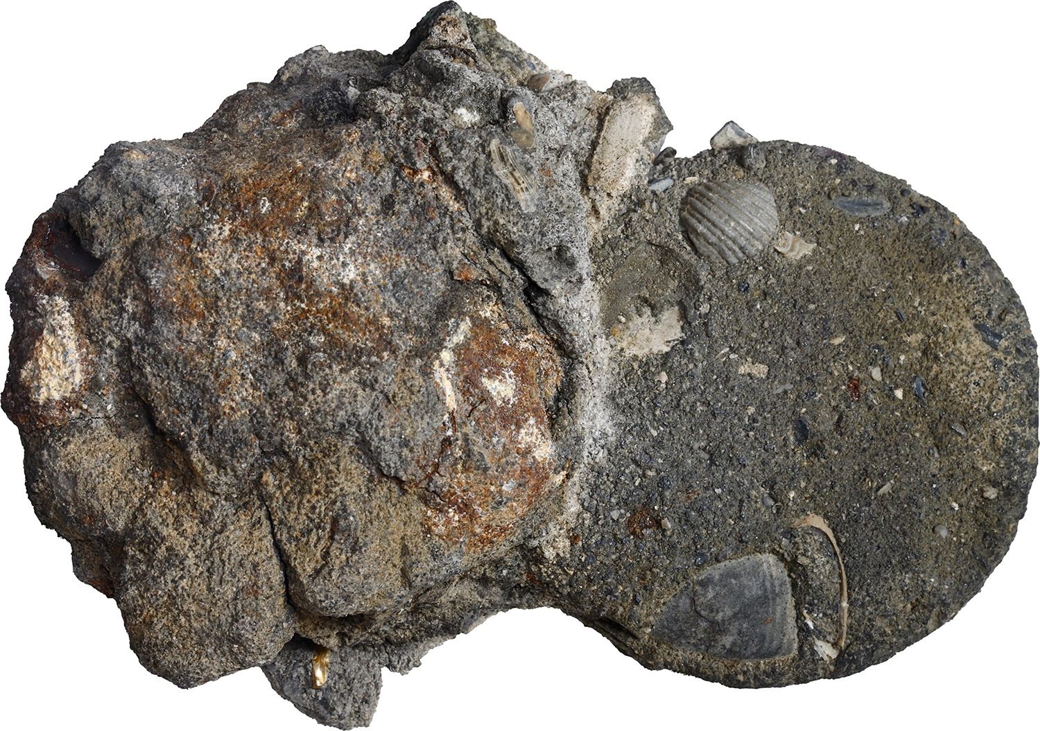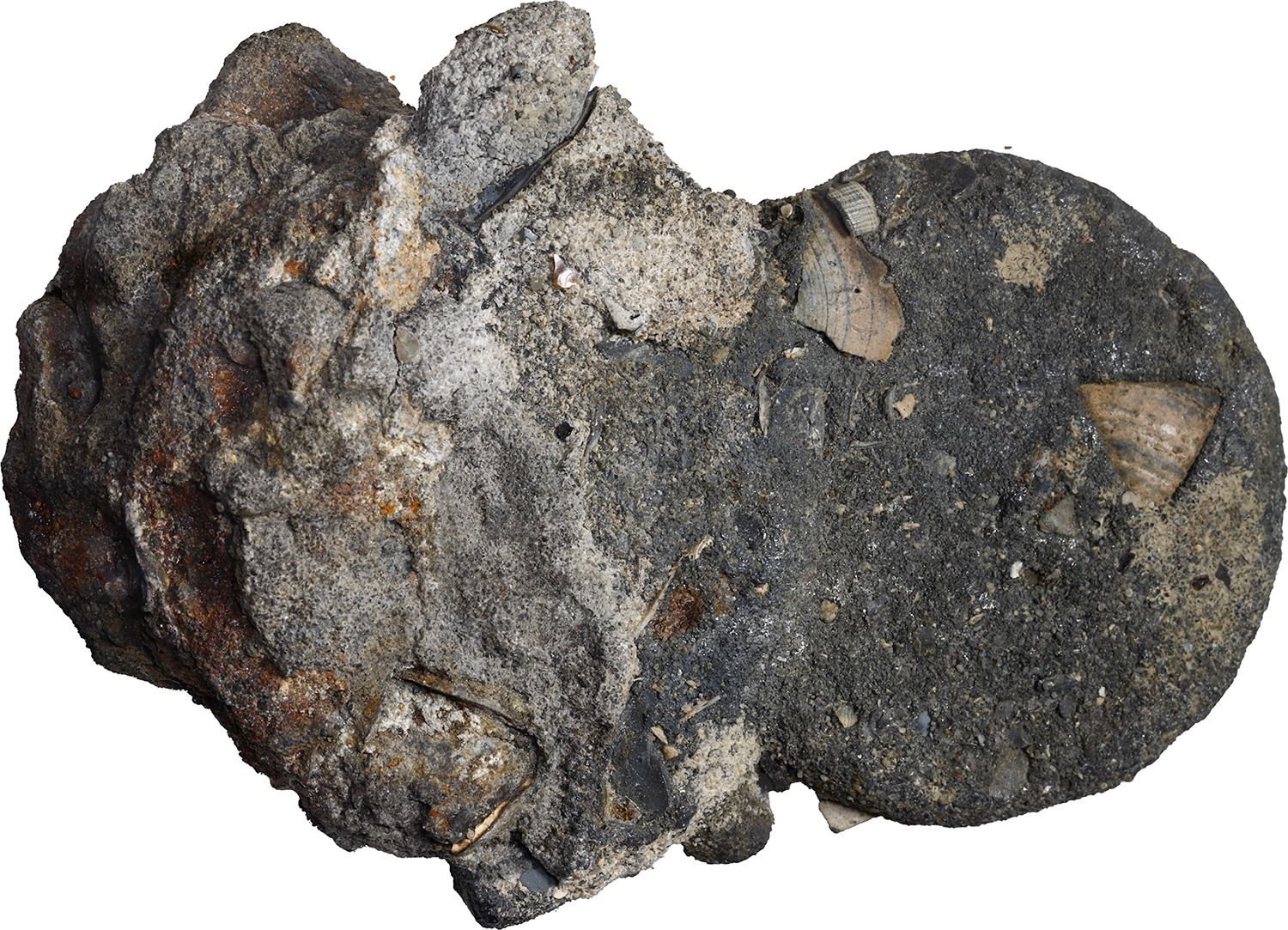 NETHERLANDS, mints uncertain, clump of two ducatoon "biscuits," dates not visible, with much encrustation (as found). 171.64 grams total. roughly 3½" x 2¼" x 1". Thickly encrusted clump with one distinct biscuit on the side and a probable second one in the large lump encrusted onto it along with some rust iron streaks and bits of dark shells. With original certificate 1152 from the salvors. Recovered from: Vliegenthart, sunk in 1735 off Zeeland, Netherlands