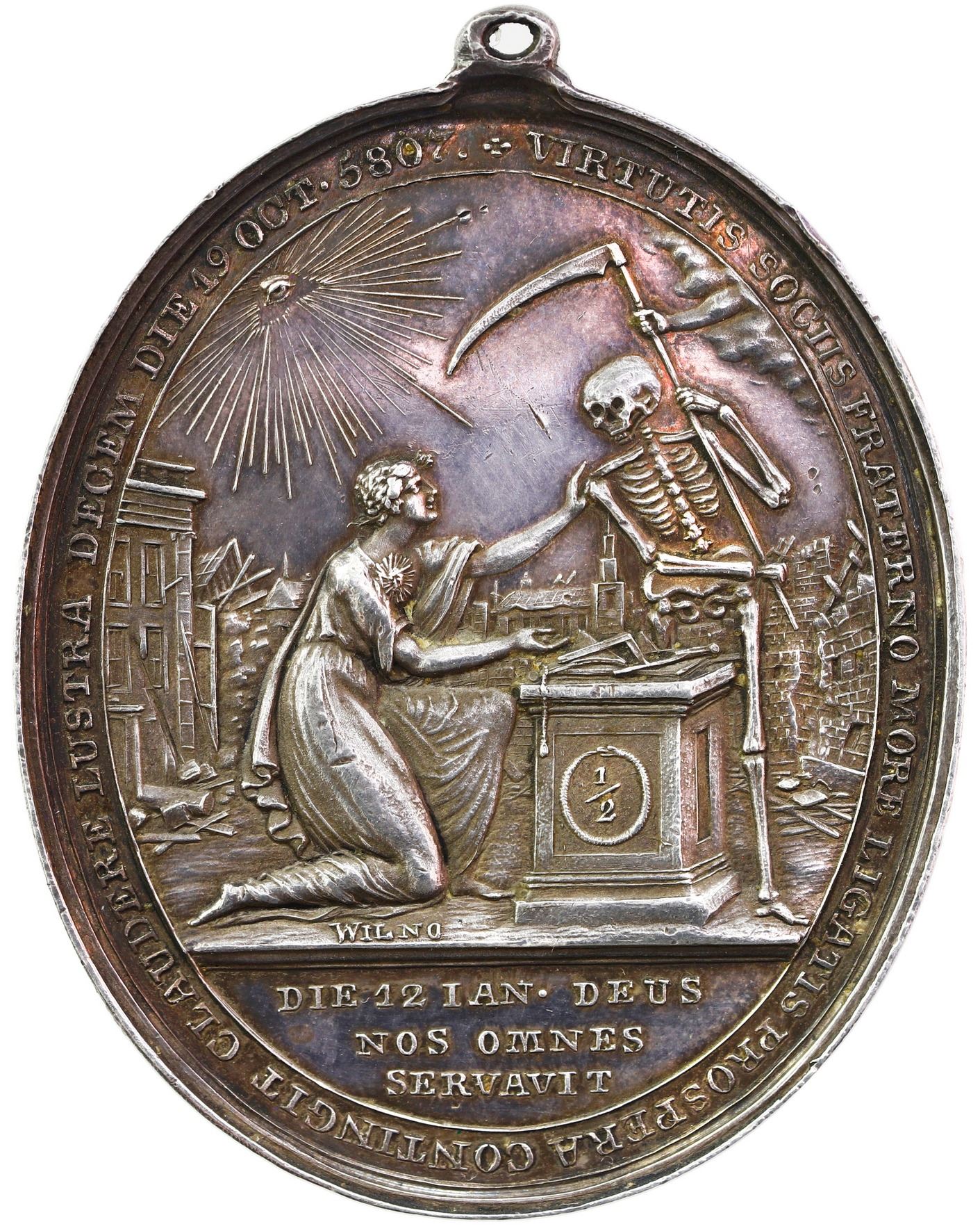 NETHERLANDS, oval silver medal, 1807, Leiden, Masonic lodge "La Vertu" / Louis Napoleon, by D.P. Wilno, very rare. Bramsen-669; Julius-1809; Nahuys-I 5.32; Kreeft-6; KPK-3859. 29.55 grams. 45.9mm x 38.2mm. Obverse with female personification of the city of Leiden kneeling before the Grim Reaper with demolished city in background within legend VIRTUTIS SOCIIS FRATERNO MORE LIGATIS PROSPERA CONTINGIT CLAUDERE LUSTRA DECEM DIE 19 OCT 5807, exergue with DIE 12 IAN DEUS / NOS OMNES / SERVAVIT; reverse with legend VIVAT LUDOVICUS NAPOLEON BENEFICUS HOLLANDIAE REX! around nine-line inscription DUM REPETET SUBITAM, / TIBI, REX: TUA LEIDA RUINAM, / REDDETUR GRATAE DEBITUS / URBIS AMOR. / VIRTUTIS NOMEN FRATRUM / LAUDESQUE MANEBUNT, / DUM PIETAS MISERIS / DULCE LEVAMEN ERIT. / S. S. V. D. E. below small coat-of-arms for the city of Leiden. This dramatically allegorical piece of art commemorates the January 12, 1807, destruction of part of Leiden from a gunpowder explosion that claimed 151 lives, injured over 2,000, and destroyed around 220 homes, in addition to the Masonic lodge "La Vertu" mentioned in the inscription. At the time, Leiden was part of the Napoleonic Kingdom of Holland and was bracing for attack from the British. Within just five hours of the explosion, King Louis Napoleon provided soldiers for the city's reconstruction, donated 30,000 guilders, granted a ten-year tax exemption, and even sent his personal physician, which earned him the nickname "Louis the Good." This example is an attractively toned AU with old hairlines, original loop at top incorporated into the high rims.