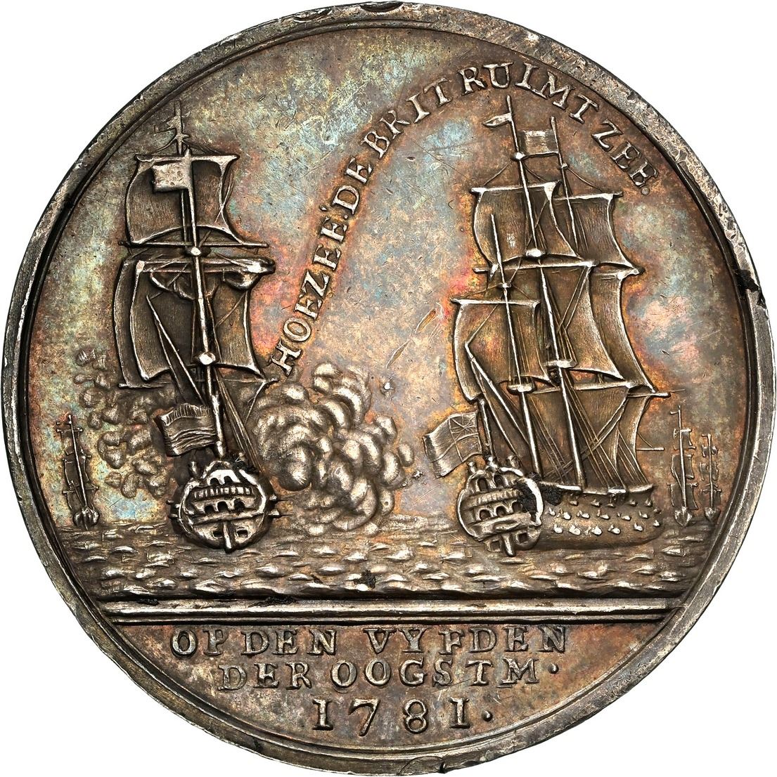NETHERLANDS, silver medal, dated 1781, Battle at Doggersbank, by Holtzhey, NGC AU details / cleaned. Betts-588; Van Loon-563. 30 mm. One side with Dutch and British sailing ships in battle with curved HOEZEE. DE BRIT RUIMT ZEE. starting from left ship and surmounting the right ship, exergue with OP DEN VYFDEN / DER OOGSTM• / 1781•; the other side with wings at top and wreath at bottom above A•V•B• and eight-line inscription in center O BATAVIER. / GOD STAAFT UW REGT. / DAAR ZOUTMAN MET / ZIJN HELDEN VEGT. / HERSTELT HIJDE EER / DER VRIJE VLAG. / TROTS OVERMAGT. / IN EENEN SLAG. Ships side with lovely dark rainbow toning, the inscription side unevenly toned over strong hairlines with luster. The battle here depicted, which ended in a stalemate, has significance to Americans as it concerned the Dutch provisioning of American colonists during the Revolutionary War.