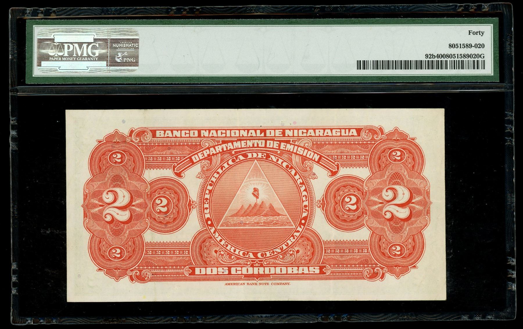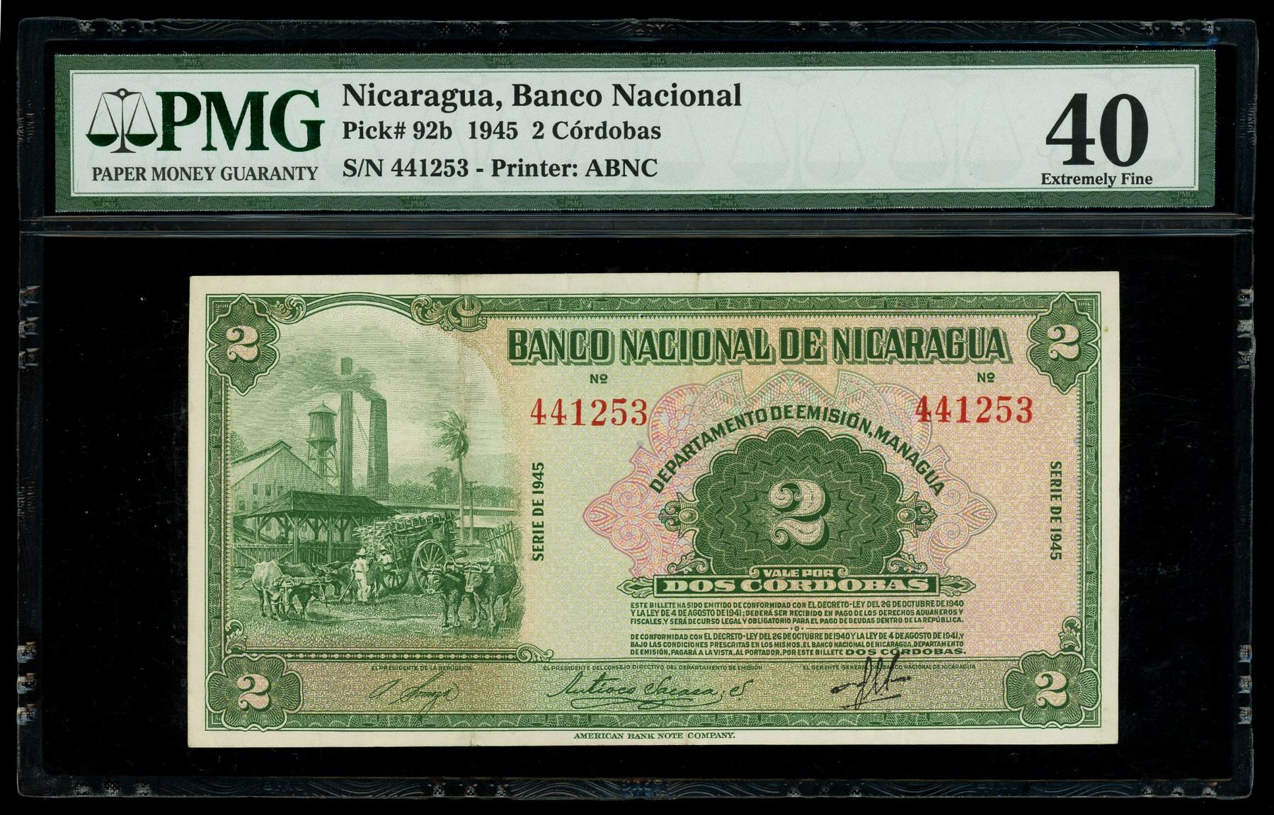 NICARAGUA, Banco Nacional, 2 córdobas, 1945, serial 441253, PMG XF 40. Pick-92b. Modestly circulated yet with bold ink colors and nice centering.
