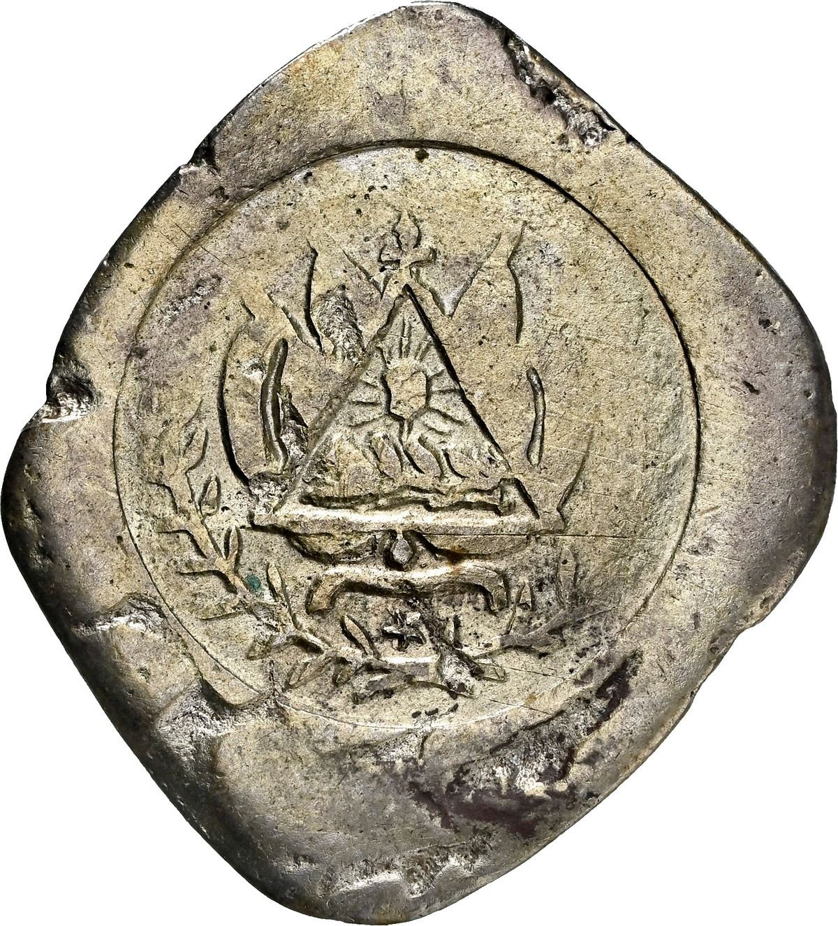 Such cross-border circulation with separate governmental validation is extremely rare. The present example is an unrecorded and presumably unique pairing of these two countermarks on the same host cob, Nicaragua (AU details) on the cross side and El Salvador (Fine details) on the pillars side, with just a hint of original cob design remaining, including assayer Y and second digit 7 of date above waves. From XRF testing we know the coin is about 38% silver and 61% copper, yet it looks like good silver, just with light golden toning. It stands to reason that a well-circulated contemporary counterfeit of correct weight and design was not even given a second look before both countermarks were applied. With NGC tag: "not encapsulated - plated".