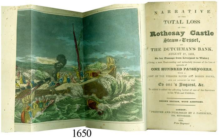Narrative of the Total Loss of the Rothesay Castle (London, 1831, 2nd edition). 23 pp, 4¼" x 7½". Small, softcover pamphlet with beautifully hand-colored foldout frontispiece showing the wrecking of the steamship Rothesay Castle on "The Dutchman's Bank" off England on August 17, 1831, printed by J. Fairburn, in nice condition (the cover a little tattered).
