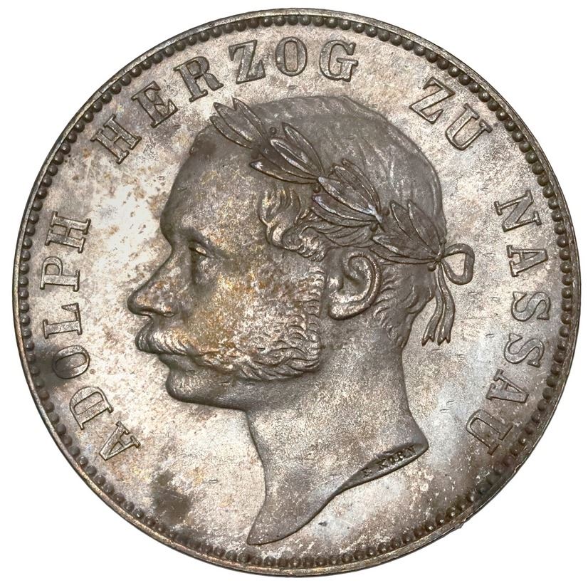 Nassau (German States), taler, 1864, Adolph, 25th anniversary of reign, NGC MS 64.