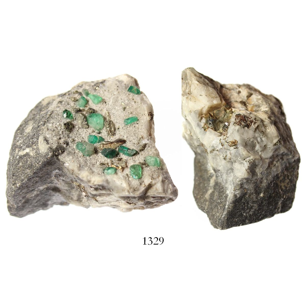 Natural Colombian emeralds with pyrite in calcite matrix, pedigreed to the DiscoverSea Shipwreck Mus