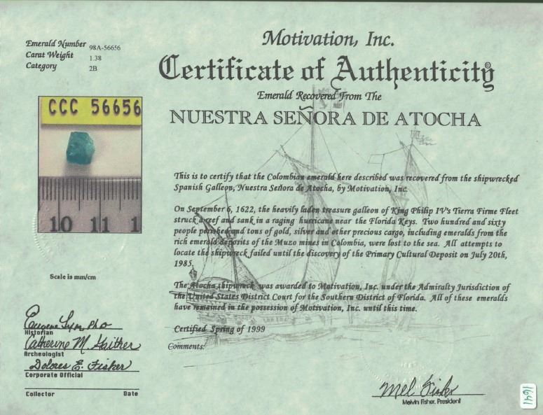 Natural emerald, 1.38 carats, grade 2B, from the Atocha (1622). Roughly 1/4" x 3/16". Triangular-shaped beryl of light green opaque color. From the Atocha (1622), with Fisher tag and certificate #98A-56656.