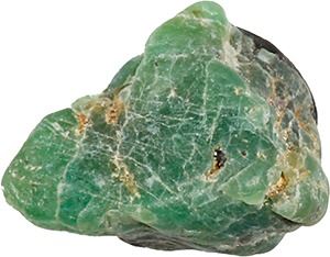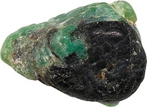 Natural emerald, 7.95 carats, ex-1715 Fleet. Roughly ½" x ½" x ¼". Large, occluded medium-green stone with dark encrustation on one side, roughly rectangular in shape. From the 1715 Fleet, with small certificate signed by Frank Noga.