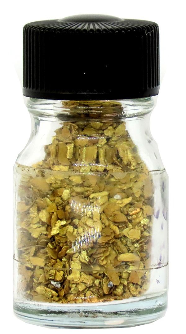 Natural gold flakes from Alaska, 26 grams total, 85% fine. 1-1/2" tall (container). A small glass vial nearly full of small flakes gleaned from panning or sluicing, each little piece about the same size (not just dust).