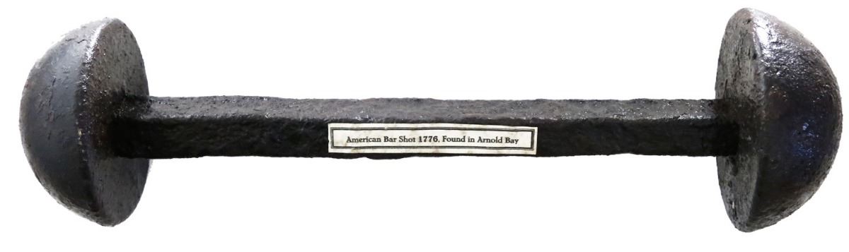 Naval barshot "4-pounder" from the American Revolutionary War, 1776. 2450 grams, 12-1/2" long, 3-1/4" diameter. Two half-cannonballs connected by a 3/4"-wide iron bar 9" long. Found in the early 1900s in the shallow waters of Arnold's Bay, Vermont (location of the naval Battle of Valcour Island), complete and intact, in conserved and stable condition, the entire surface pitted with some surface encrustation. An old attached tag states, "American Bar Shot 1776 Found Arnold Bay." With photo-certificate.