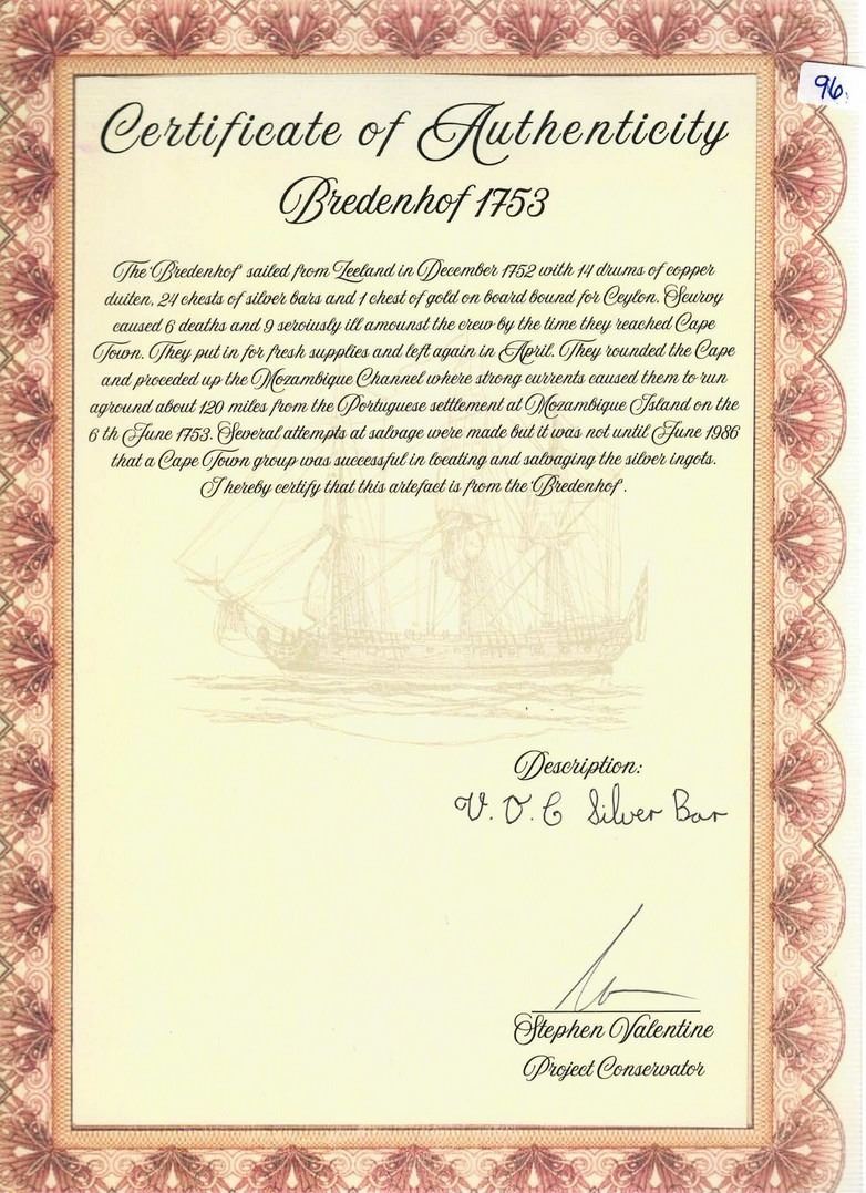 Neatly formed Dutch silver ingot, 1933 grams, about 98.5% fine, with markings of VOC (Dutch East India Co.) monogram with Z (Zeeland) above and M (Middelburg) below, assayer initials FE (François Englesen, Jr) and fleur-de-lis within shield, ex-Bredenhof (1753), ex-Botha. 6" x 1½" x 1". Relatively smooth and nicely toned surfaces with both markings near center of one side, one end of the bar with a typically deep pit and the other with no less than five diagonal slices removed in its time to lower the weight to some kind of standard for shipping, this particular ingot noteworthy as the one chosen as a reward by the diver who found the first chest of ingots. From the Bredenhof (1753), with certificate from salvor Tommy Botha, who selected this ingot for himself as finder of the first chest of ingots, with original Christie's (Amsterdam) auction catalog of December 1986, and with certificate from conservator S. Valentine.