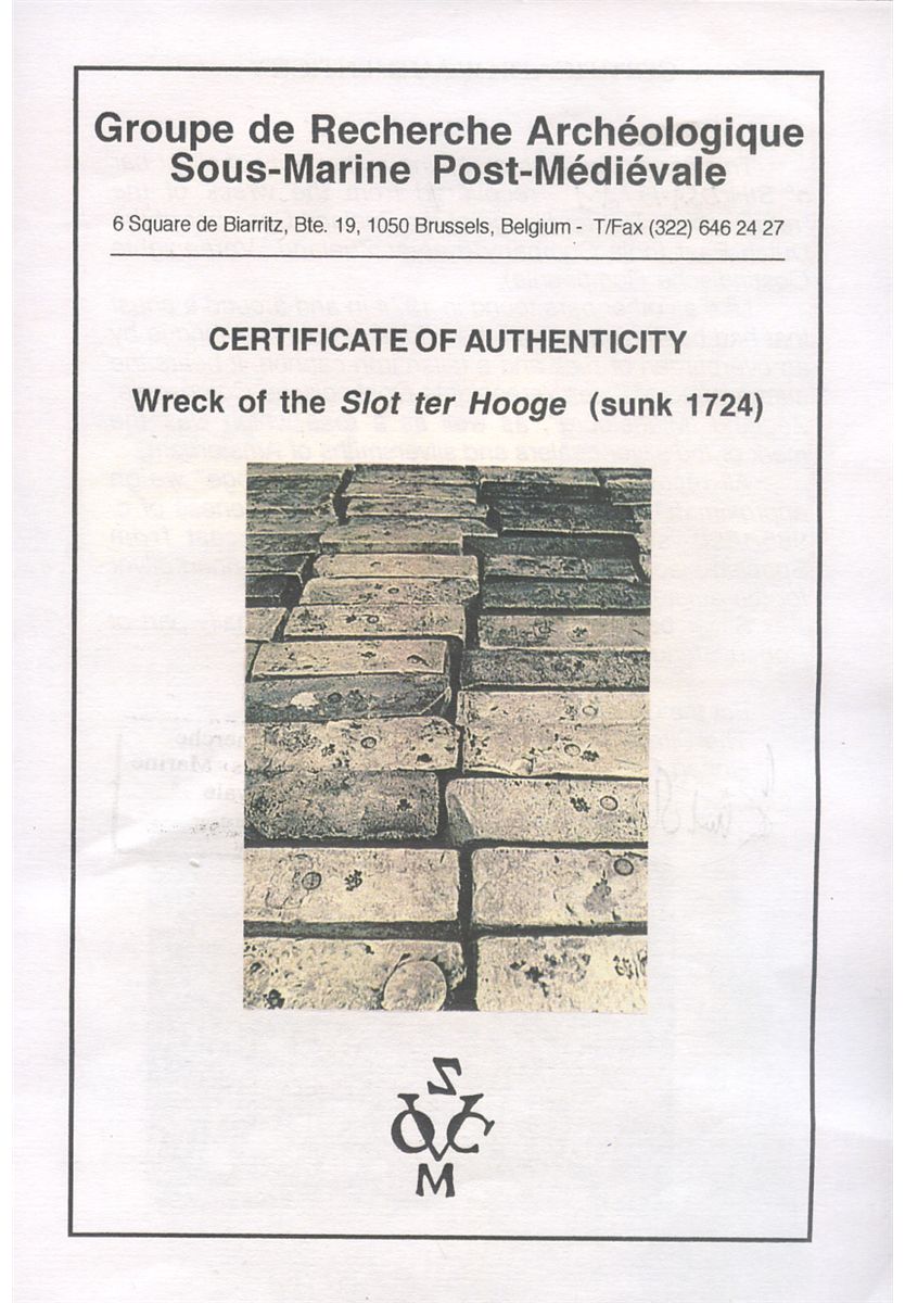 Neatly formed silver ingot, 1945 grams, about 98.5% fine, with stamps of the Zeeland chamber of the VOC (Dutch East India Co.), cast in diagonal to bar width, from the Slot ter Hooge (1724). 5-1/8" x 1-1/2" x 1-5/8". Typically neatly cast bar with clear but tiny little markings on narrow side, one end with deep pit plugged with encrustation and diagonally sliced to adjust the weight, minimal corrosion. From the Slot ter Hooge (1724), with certificate from the salvager (Stenuit) and accompanied by a Zeeland 2 stuivers of 1724 (the "key coin" for identifying the wreck in 1974).