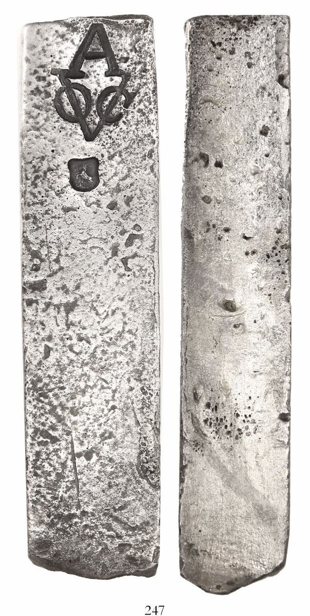 Neatly formed silver ingot from the Rooswijk (1739), 1933 grams, about 98.5% fine, with stamps of the Amsterdam chamber of the VOC (Dutch East India Co.) and "jumping goat" assayer-mark of Otto and/or Wouter Buck. 6-1/4" x 1-1/2" x 1-1/4". Very neatly cast and well preserved as usual (minimal surface corrosion), with very clear markings, the cut end a bit worn and with light encrustation in the usual shallow depression. From the Rooswijk (1739), with original certificate #RK04A0574 from the salvagers.