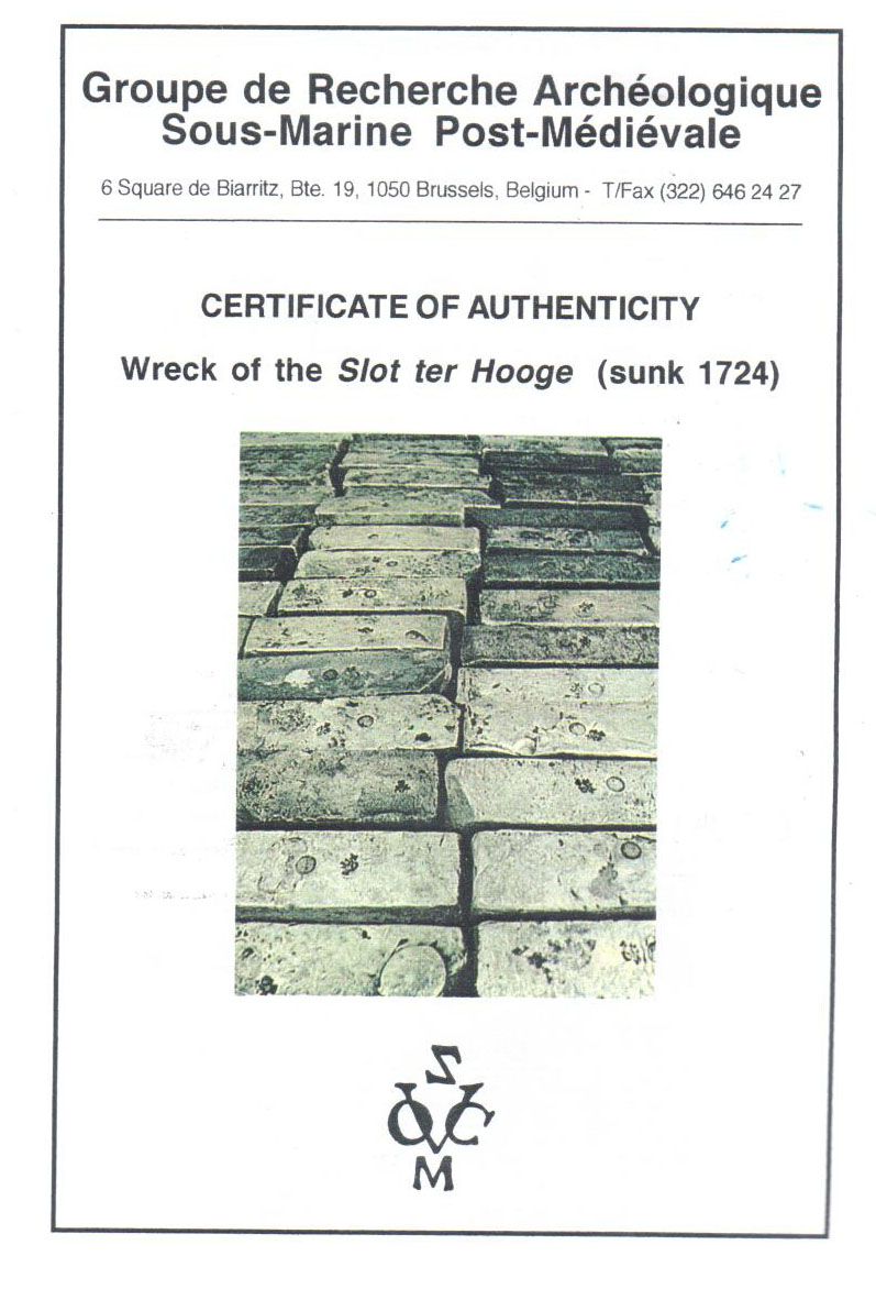 Neatly formed silver ingot from the Slot ter Hooge (1724), 1922 grams, about 98.5% fine, with stamps of the Zeeland chamber of the VOC (Dutch East India Co.), cast in parallel to bar width. 5-1/2" x 1-1/2" x 1-1/8". Typically neatly cast bar with clear but tiny little markings on broad side, one end with deep and heavily encrusted pit and very small diagonal slice to adjust the weight, minimal corrosion but some dark encrustation on side with markings. From the Slot ter Hooge (1724), with certificate from the salvager (Stenuit).