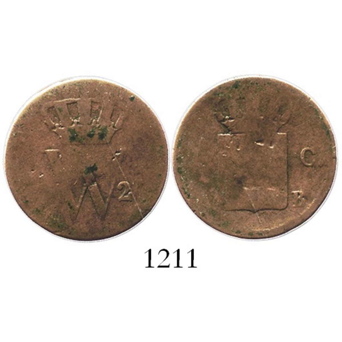 Netherlands (Kingdom), copper 1 cent, William I, 1821-B, very rare key date (lowest mintage). KM-47. 3.4 grams. Weak but discernible AVG with dents on shield, light brown color all over.
