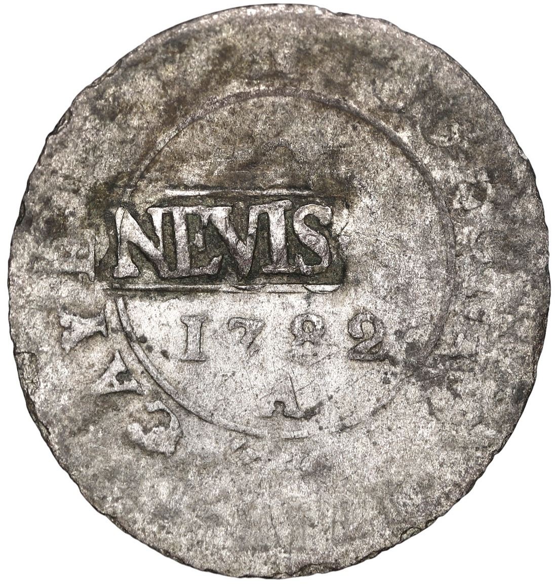 Nevis, black dogg (three halfpence), rectangular countermark NEVIS on a genuine Cayenne 2 sous 1782-