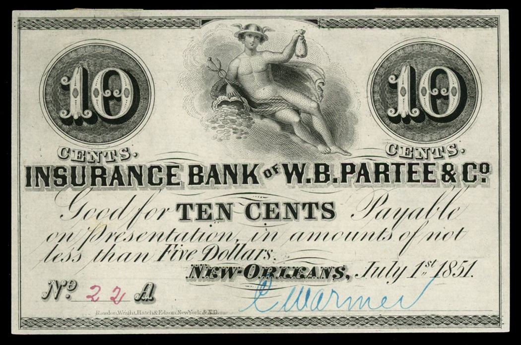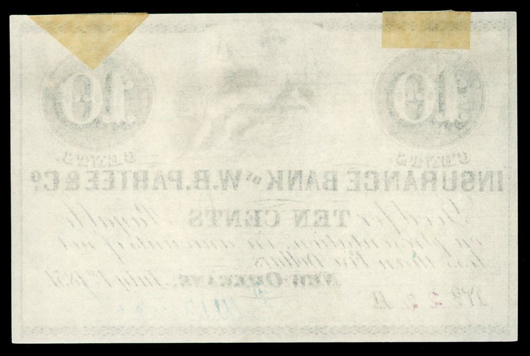 New Orleans, Louisiana, Insurance Bank of W.B. Partee & Co., 10 cents proof, July 1, 1851, pp A, rare. Haxby-unl. This is only the second example known in proof since the first, then described as "might be unique," was sold in the Eric P. Newman VII sale in 2015. W.B. Partee was a prominent business firm in pre-Civil War New Orleans. UNC with spurious serial and signature plus mounts on the back, bright paper quality with strong embossing for the design.