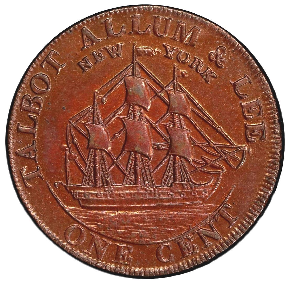 New York, USA, copper cent token, Talbot, Allum, & Lee, 1794, with NEW YORK, lettered edge, PCGS AU details / altered surface. Fuld-4; W-8590, R.1. From 1794 to 1795, the import firm of Talbot, Allum, & Lee, based in New York City, had tokens struck in Britain to promote their business. As the following two lots show, mules were also struck with the Talbot die partnered with English token designs. High AU example with bright surfaces apparently from replating. Please use this link to verify the certification number