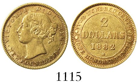 Newfoundland, Canada, 2 dollars, 1882-H. KM-5 3.32 grams. XF with light red toning and traces of luster in legends, no problems.
