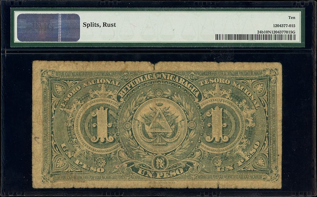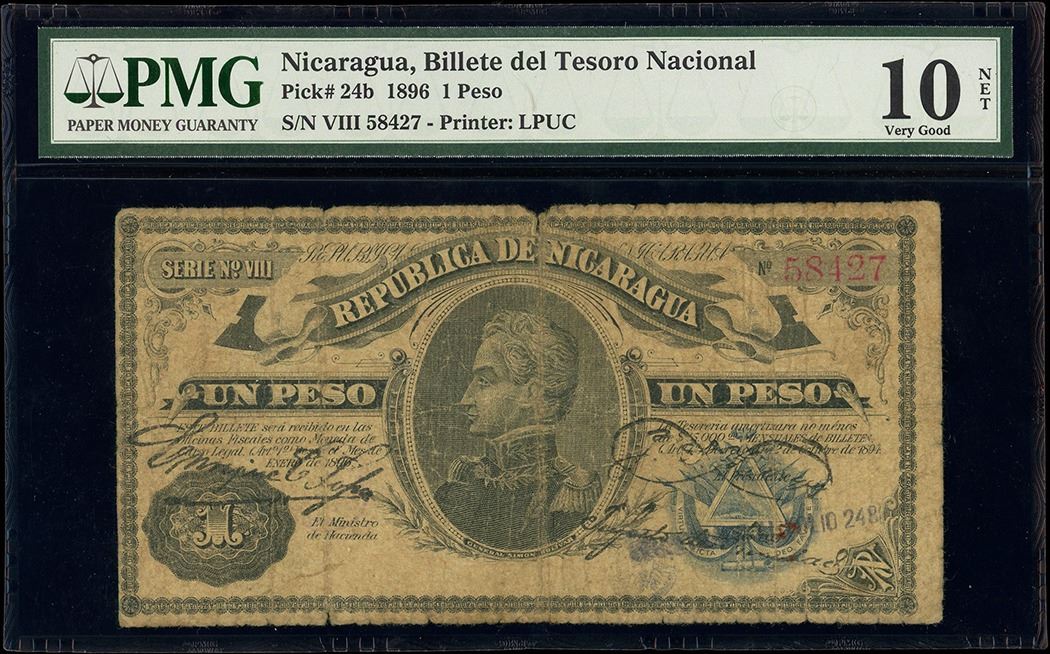 Nicaragua, Billete del Tesoro Nacional, 1 peso, 1896, series VIII, serial 58427, PMG VG 10 net / splits, rust. SCWPM-24b. A large portrait of Simon Bolivar features prominently on the front of this early Nicaraguan note printed by Paydt, Upham & Co.; the back is an ornate combination of the national arms and denominators. Well circulated with some edge splits and a small rust spot at lower right (noted on the label), the design still quite vivid in spite of the handling. PMG #1204377-015.