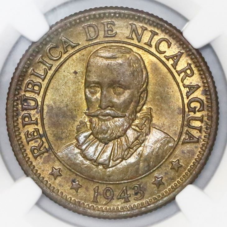 Nicaragua, brass 25 centavos, 1943, NGC MS 63.