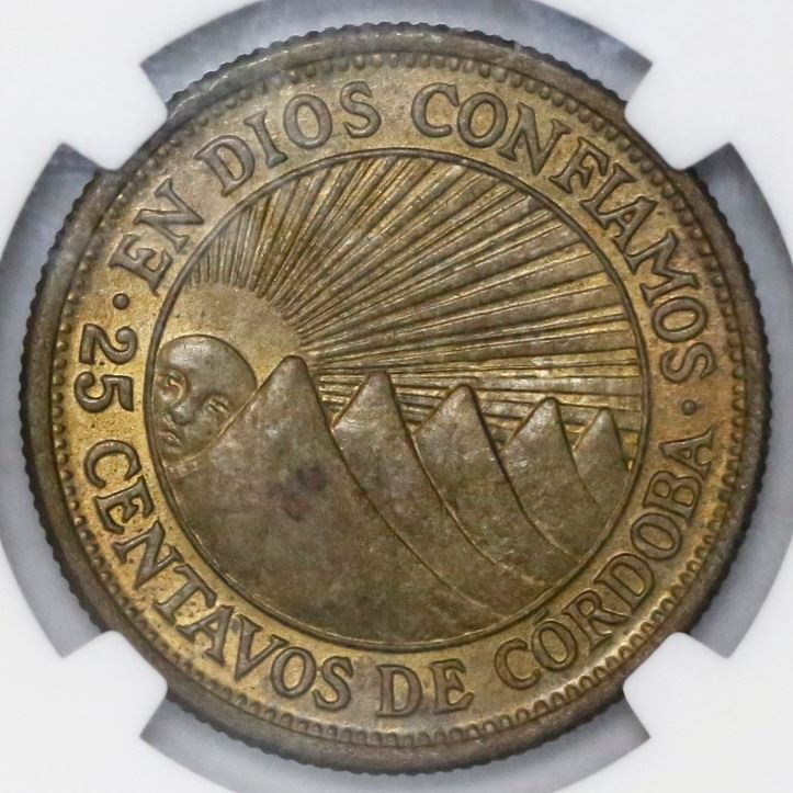 Nicaragua, brass 25 centavos, 1943, NGC MS 63. KM-23. 7.48 grams. Brassy color with some spots of red-brown toning. NGC #4703646-0015.