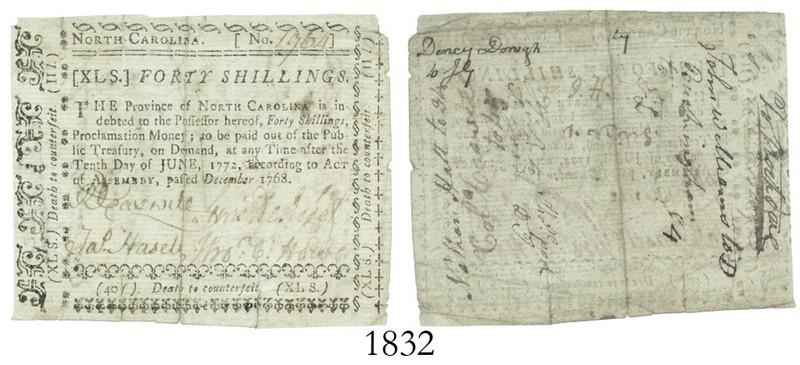 North Carolina, 40 shillings, 1768, PMG Choice Fine 15 Restoration. 3-3/8" x 2-3/4". Small colonial note denominated in "Forty Shillings, Proclamation Money," to be repaid after June 10, 1772, printed in black on one side, with signatures in shades of black on both sides, with tiny pinholes and repaired creases but otherwise nice, with ominous phrase "Death to counterfeit" printed in margins.
