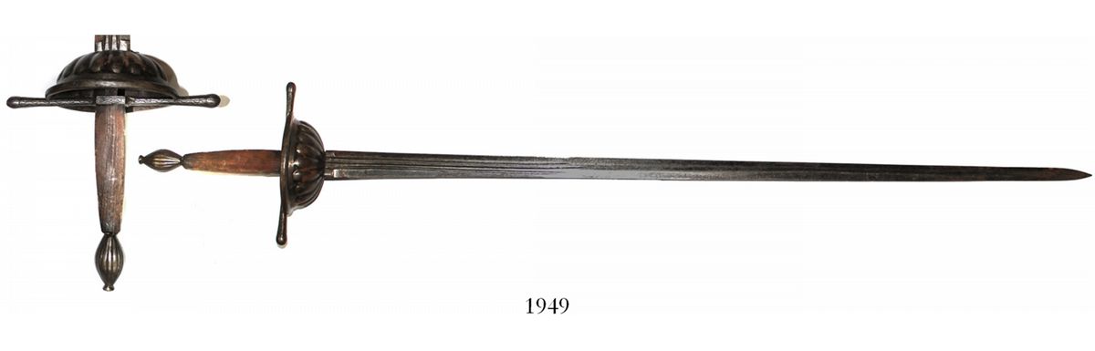 Northern European cuphilt rapier, 1500s-1600s. 1220 grams; 46" long. Long, straight, sharp blade with minimal rust spots, deep blood grooves, intact steel cup (also slightly rusty) with ornately engraved quillion, steel pommel and rectangular wood grip, excellent condition overall considering its age. With photo-certificate.