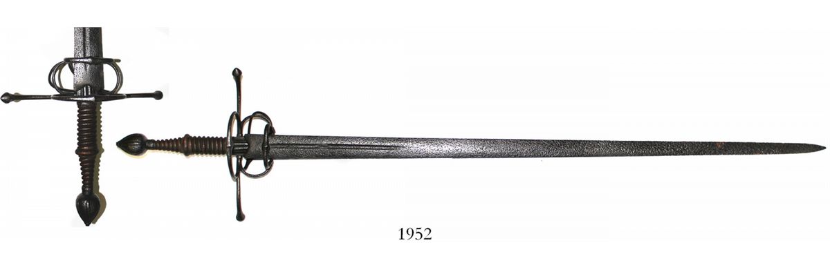 Northern European military-style broadsword, ca. 1570-1620. 1190 grams; 48" long. Long, intact but heavily pitted blade (deep blood groove) and ornate hilt, the teardrop-shaped pommel also pitted, grooved wooden grip (intact), an impressively large weapon. With photo-certificate.
