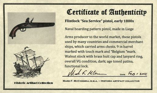Northern European naval flintlock "sea service" pistol, 1800s. 1214 grams, 15-1/2" long, 9" barrel length. Typical naval boarding pistol, made in Liege and used by many countries and commercial merchant ships, with barrel bearing a touch mark and stamped BELGIUM, the walnut stock with simple brass butt cap and lanyard ring. Overall very good condition, dark with age-toned patina, functional lock. With photo-certificate.